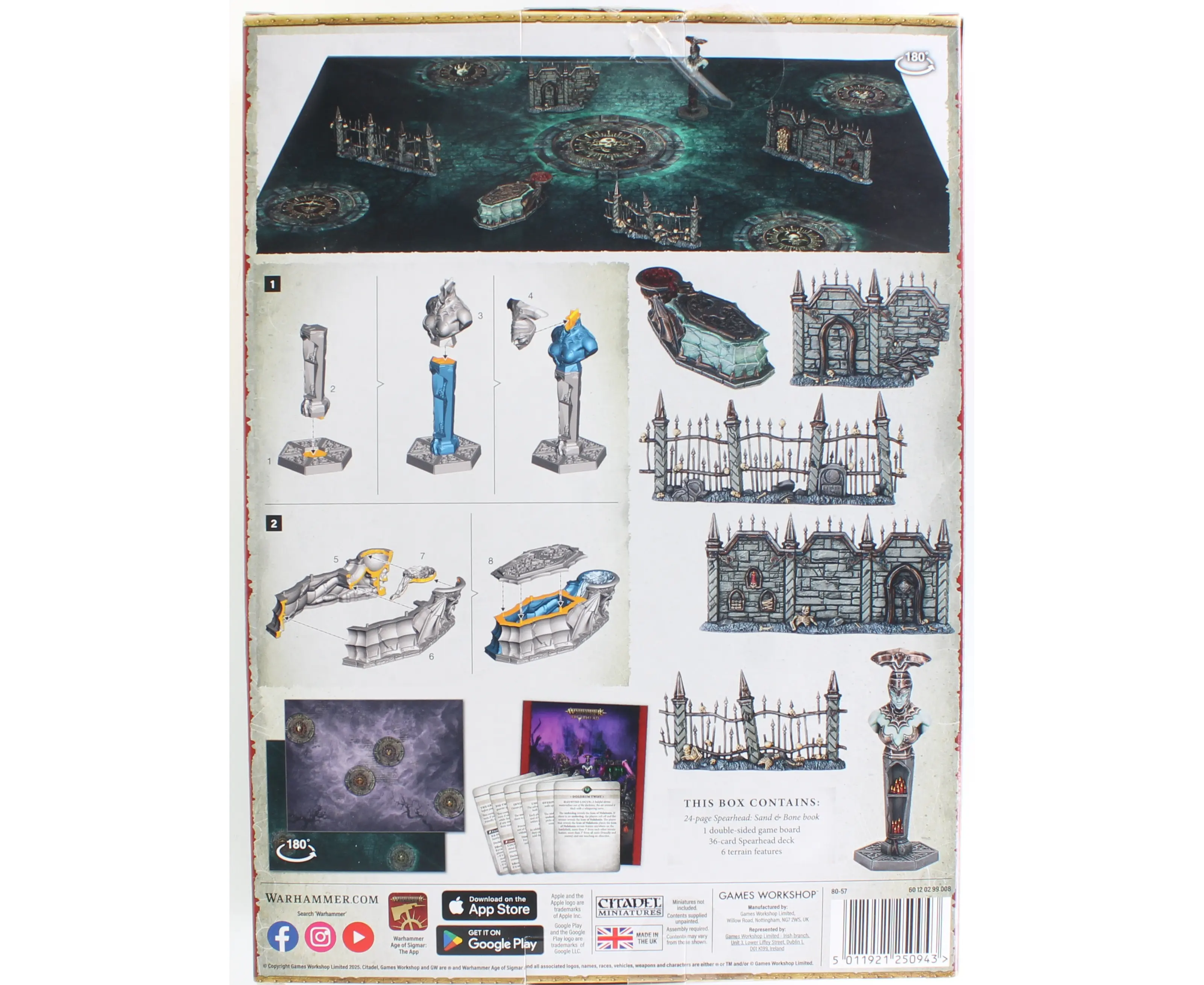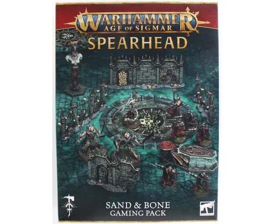 Inside the box, you'll find six thematic terrain pieces inspired by the deathly aesthetic of Shyish, along with a double-sided game board that brings both regions to life (or unlife). The included 24-page Spearhead: Sand & Bone book introduces a brand-new battlepack for Spearhead play, as well as rules for four all-new Spearhead forces. You'll also get a full set of 36 Spearhead cards - essential for play - including six Twist cards for each side of the board and two decks of 12 Battle Tactic cards. Terrain supplied in the box is unpainted and requires assembly.