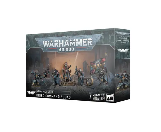 Krieg's officers are as courageous as the soldiers they lead! The Krieg Command Squad is headed by a senior Lord Commissar, accompanied by a Prefectus Militant and four seasoned veterans equipped with various communications and medical tools. These models are supplied unpainted and require assembly.