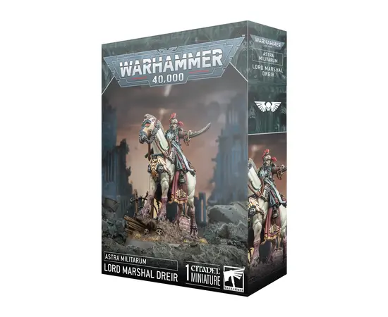 Command the indomitable Death Korps of Krieg from the front with Lord Marshal Dreir, a masterful battlefield commander of the Astra Militarum. He's always at the center of the fiercest combat ontop his loyal steed ES819. This model makes for a great centerpiece for your mounted cavalry section of the Death Korps. This model is supplied unpainted and requires assembly.