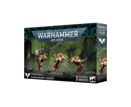 The Sanguinary Guard serve as the elite bodyguards for the ChapterÂ’s greatest heroes, clad in exquisite armor and wielding shining relic weapons. This multi-part plastic kit assembles three Sanguinary Guard, equipped with either encarmine blades or spears. The set includes the option for one to carry a Sanguinary Banner and another to be armed with an inferno pistol. These models are supplied unpainted and require assembly.