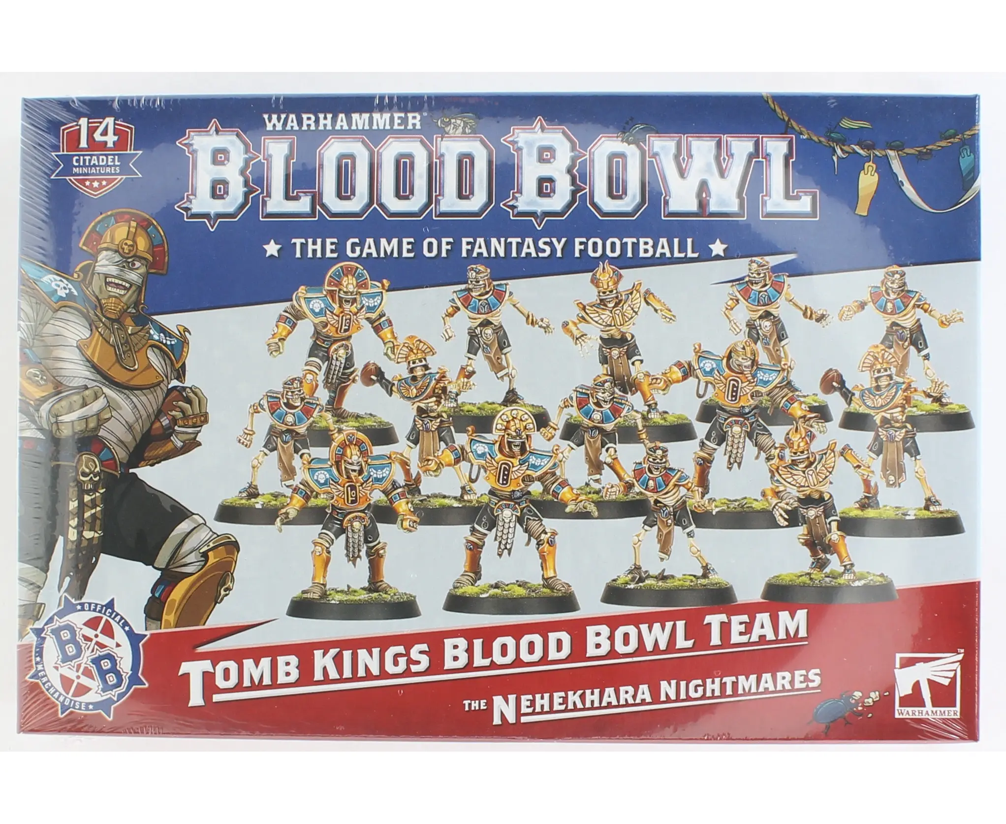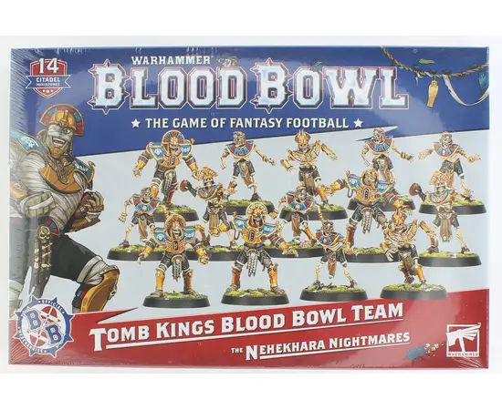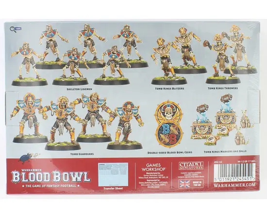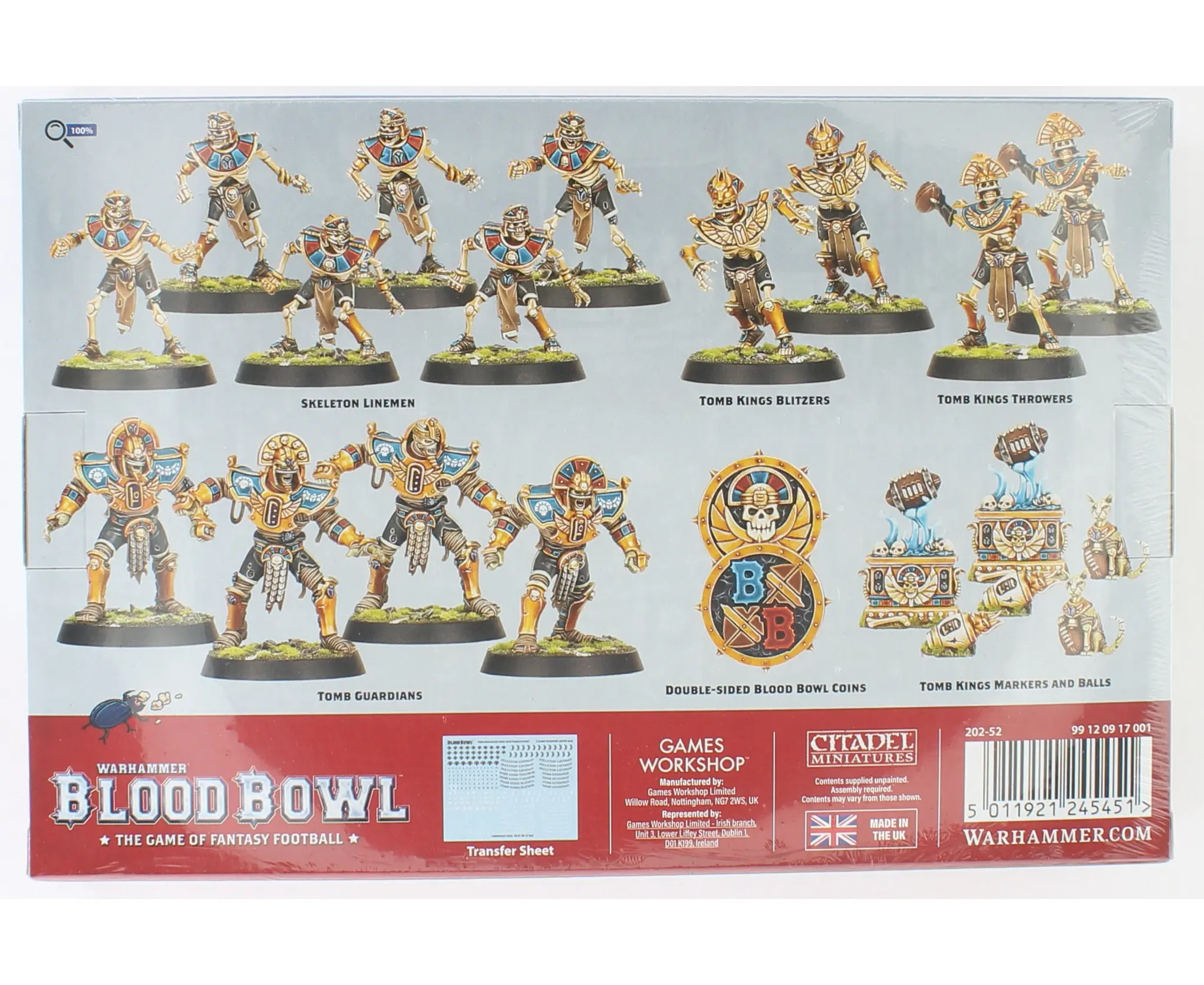 The Tomb Kings rise once more, bringing a touch of ancient grandeur and eternal precision to the Blood Bowl pitch. Each team set includes 14 multipart plastic players – two Tomb Kings Blitzers, two Tomb Kings Throwers, four mighty Tomb Guardians, and six Skeleton Linemen – along with two double-sided team coins, two Turn and Re-roll markers, and four footballs to keep the game in motion. To crown their ancient glory, the set also includes a Tomb Kings Team transfer sheet featuring 298 individual decals, perfect for adorning your players in regal symbols of eternal domination.