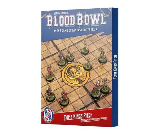 Hold onto your home field advantage with a team-themed pitch board that brings your faction’s flair to every match! The Tomb Kings pitch lets you play amid the eerie grandeur of an ancient burial chamber, complete with a darkened “Wailing Souls” variant on the reverse side for when the dead rise in force. This set also includes two double-sided dugouts matching both sides of the pitch, perfect for tracking scores, reserves, re-rolls, and injuries in style.