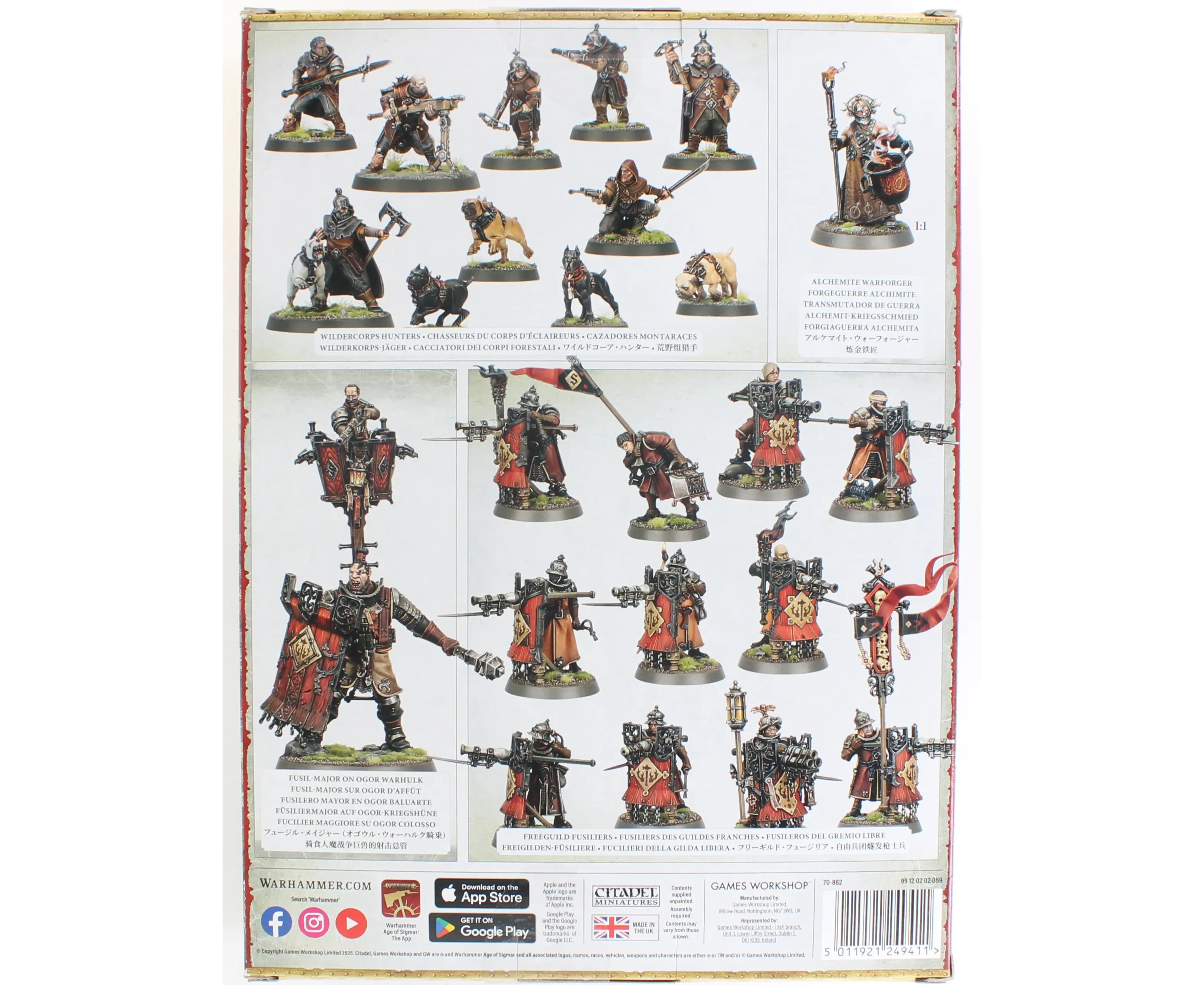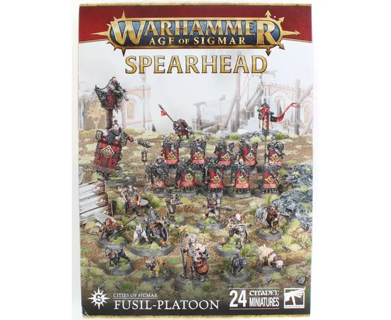 The Fusil-platoon is a highly adaptable mobile gunline within the Cities of Sigmar, blending nimble skirmishers with heavy firepower to outmaneuver and outgun the enemy. At the heart of the formation is a Fusil-Major mounted on an Ogor Warhulk, serving as both leader and forward observer, while an Alchemite Warforger bolsters the melee capabilities of a roaming pack of 11 Wildercorps Hunters. Supporting them from the rear are two units of five Freeguild Fusiliers, laying down punishing blackpowder salvos from a distance.The box also includes two Cities of Sigmar transfer sheets, each packed with 410 individual transfers to help bring your force to life on the tabletop.1 Fusil-Major on Ogor Warhulk1 Alchemite Warforger11 Wildercorps Hunters5 Freeguild Fusiliers (x2 units)2 Cities of Sigmar Transfer SheetsThese models are supplied unpainted and require assembly.