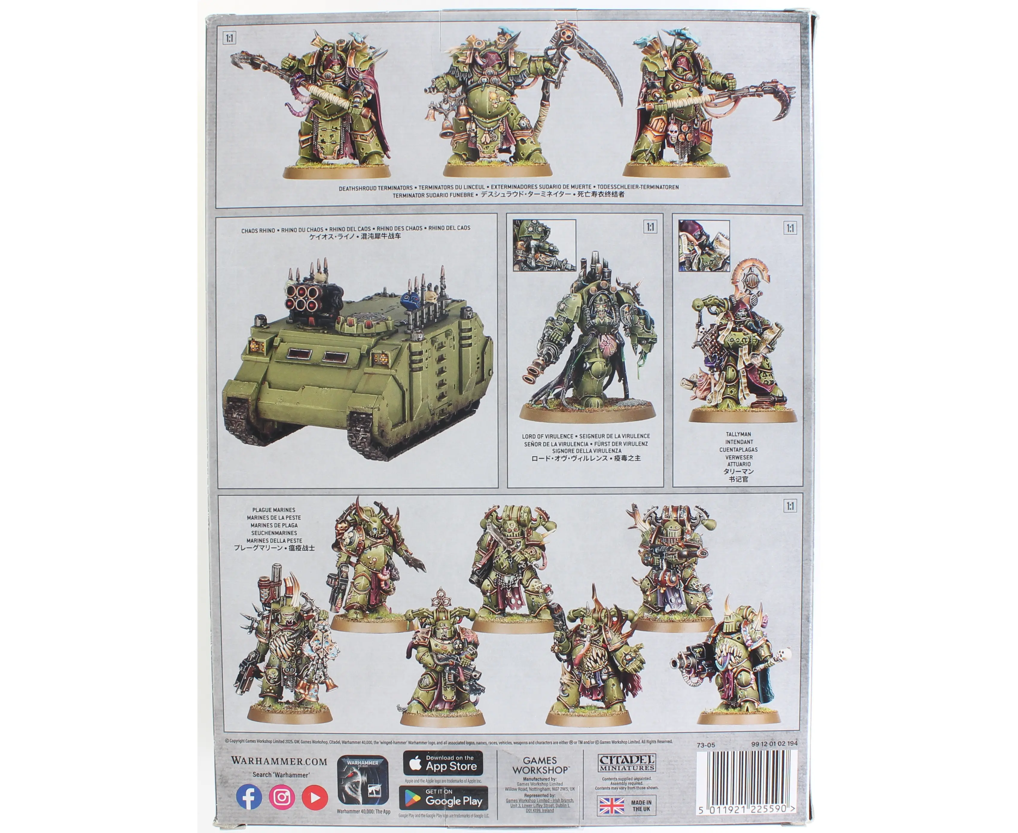 Leading the charge is the Lord of Virulence, a champion of decay who turns your volleys of fire into withering storms of corruption. Supporting him is a Tallyman, ensuring your forces operate with grim precision, while Deathshroud Terminators and Plague Marines anchor your frontline with foul tenacity. Need to get your warriors to the fight fast? The included Chaos Rhino delivers them right into the heart of battle, where they shine brightest - or darkest.