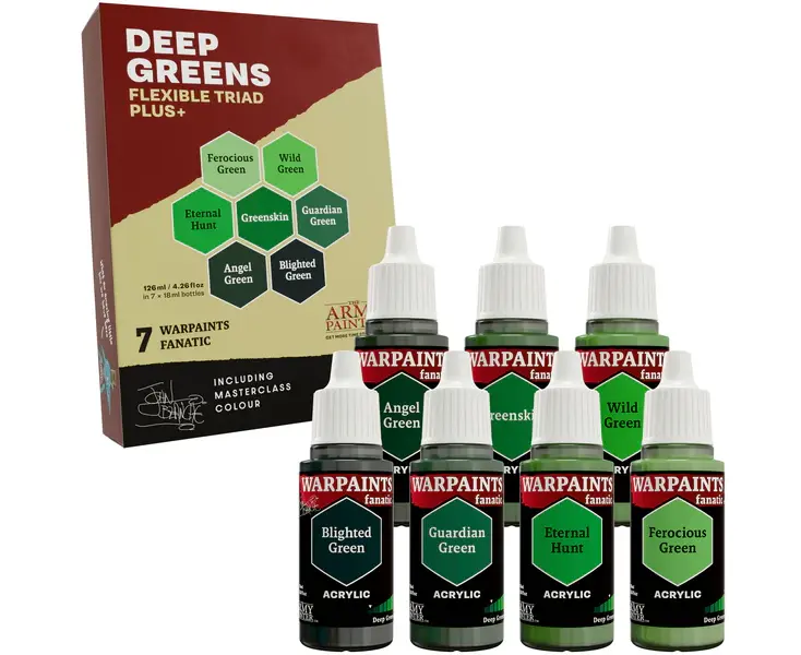 Wander into verdant forests and bring legendary woodland creatures to life with the Flexible Triad PLUS+ Deep Greens. These vibrant colours capture everything from foliage to light moss to the skin of orks and ogres. This set of seven progresses from the dark hue of trees to the bright green of a sunlit meadow. John Blanche: Blighted Green gives you the option for a more sinister base.