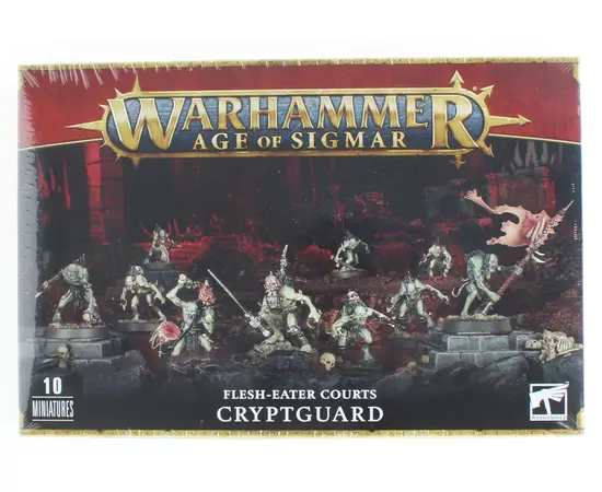 Cryptguards serve as the devoted protectors of the abhorrants, who believe themselves to be wielding the finest weapons sourced from their armories, while in reality they actually are corroded relics soaked in corpse-juices. The delusional knights are here to serve in the battleline of your Flesh Eater Courts army. This set assembles 10 Cryptguards, offering choices for weapons and heads, and includes options for a champion, standard bearer, and musician. These models are supplied unpainted and require assembly.