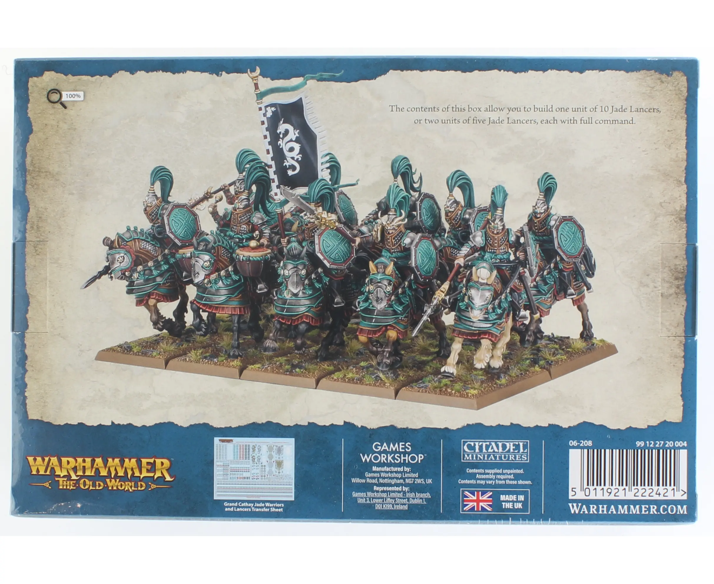 Attention: Due to limited supply on this item, we are unable to accept preorders for it at this time.Jade Lancers are Grand Cathay's elite heavy cavalry- linebreakers who smash through enemy ranks with spear and discipline. This kit builds 10 Jade Lancers, complete with enough command options to split them into two units of five. Inside you'll also find a Grand Cathay transfer sheet loaded with 404 decals, giving you everything you need to field these unstoppable riders in style.These models are supplied unpainted and require assembly.
