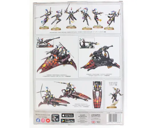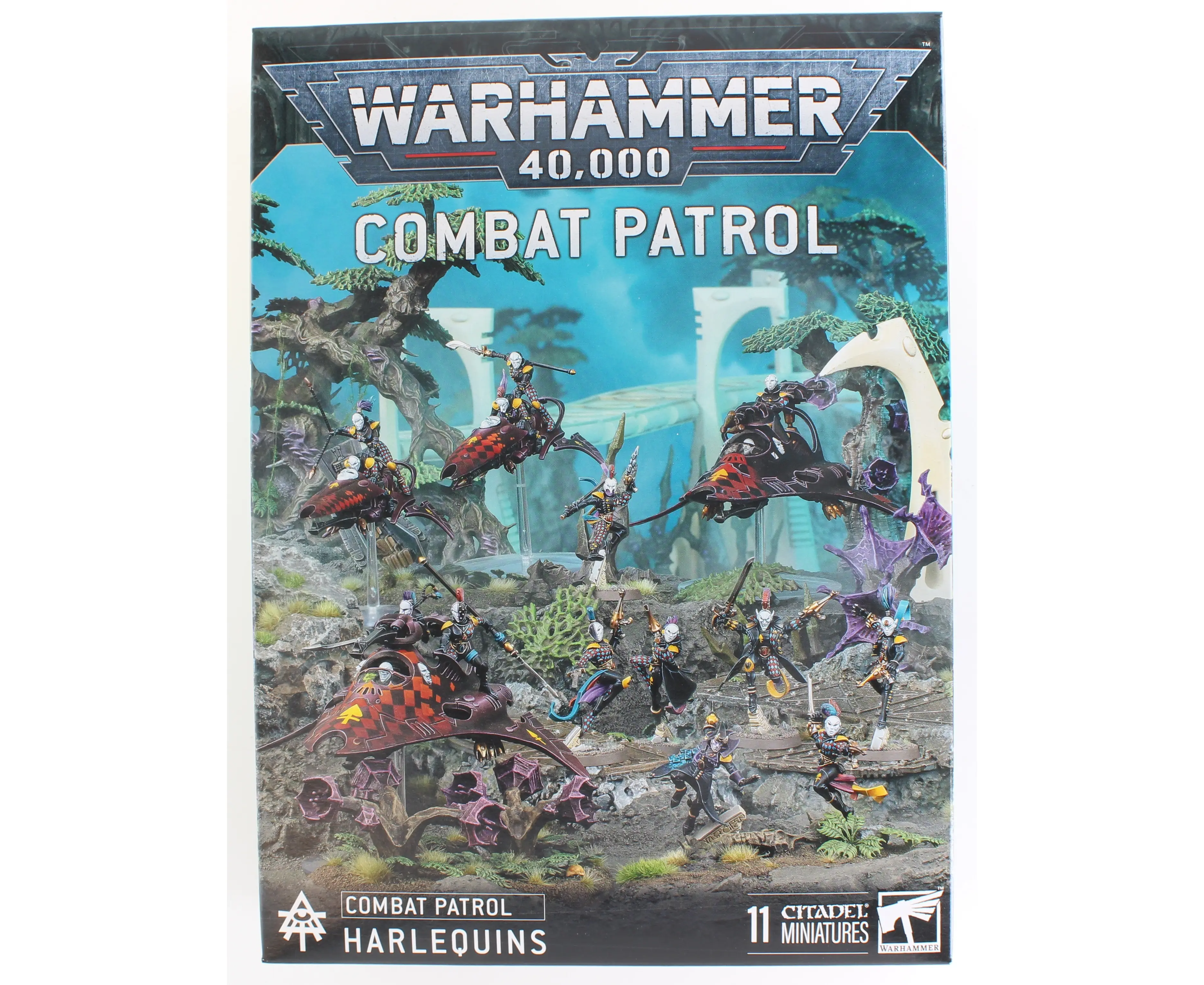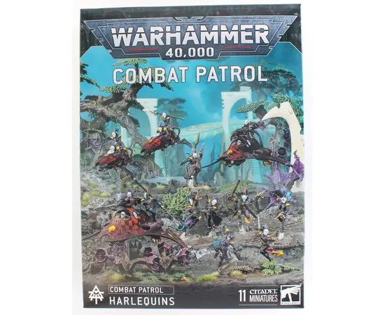 Take to the stage of war with Combat Patrol: Harlequins. This boxed set contains six Harlequin Players forming a deadly Troupe, a swift Starweaver transport, two agile Skyweaver jetbikes, a powerful Voidweaver attack craft, and the mesmerizingly lethal Solitaire – the cursed performer who embodies She Who Thirsts in every performance.