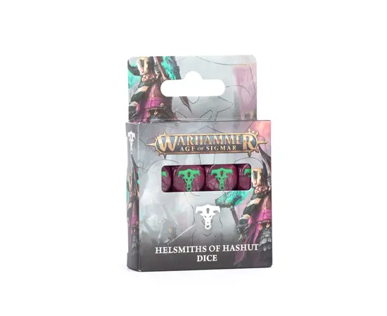 16 dice forged in a rich, marbled purple. Each die features striking green pips and the HelsmithsÂ’ faction icon in place of the six.