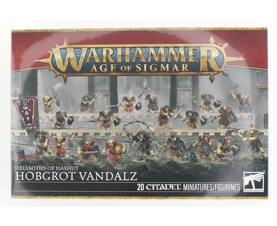 Hobgrots are cunning, treacherous creatures whoÂ’ve learned that serving the Helmsmiths of Hashut is far safer than opposing it. This set builds 20 Hobgrot Vandalz, including a sneaky champion armed with either a cruel chain weapon or a vicious dagger. YouÂ’ll also find a Helsmiths of Hashut transfer sheet featuring 450 transfers.