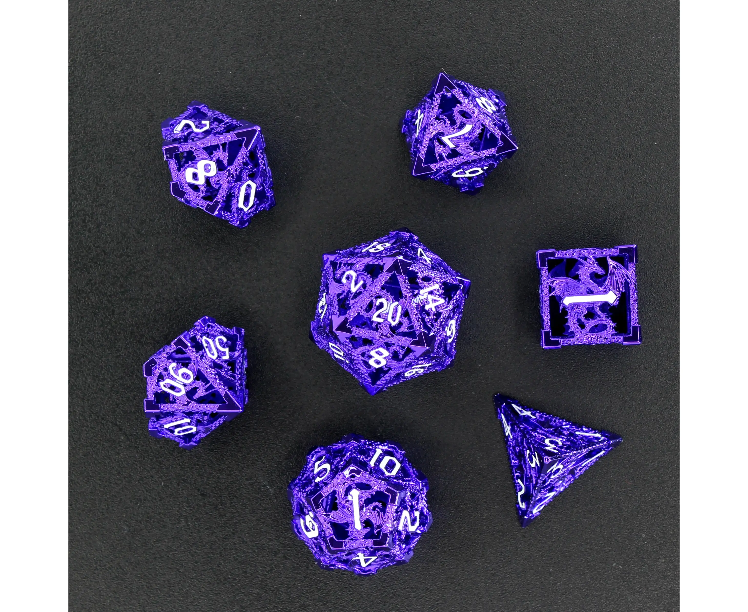 This seven-piece hollow metal dice set is detailed in a metallic purple tone with a lattice of a dragon on every face. Each number is suspended within the dragons, creating a striking layered design inked in white for better readability. Perfect for dragon-folk characters or just fans of dragons in general.