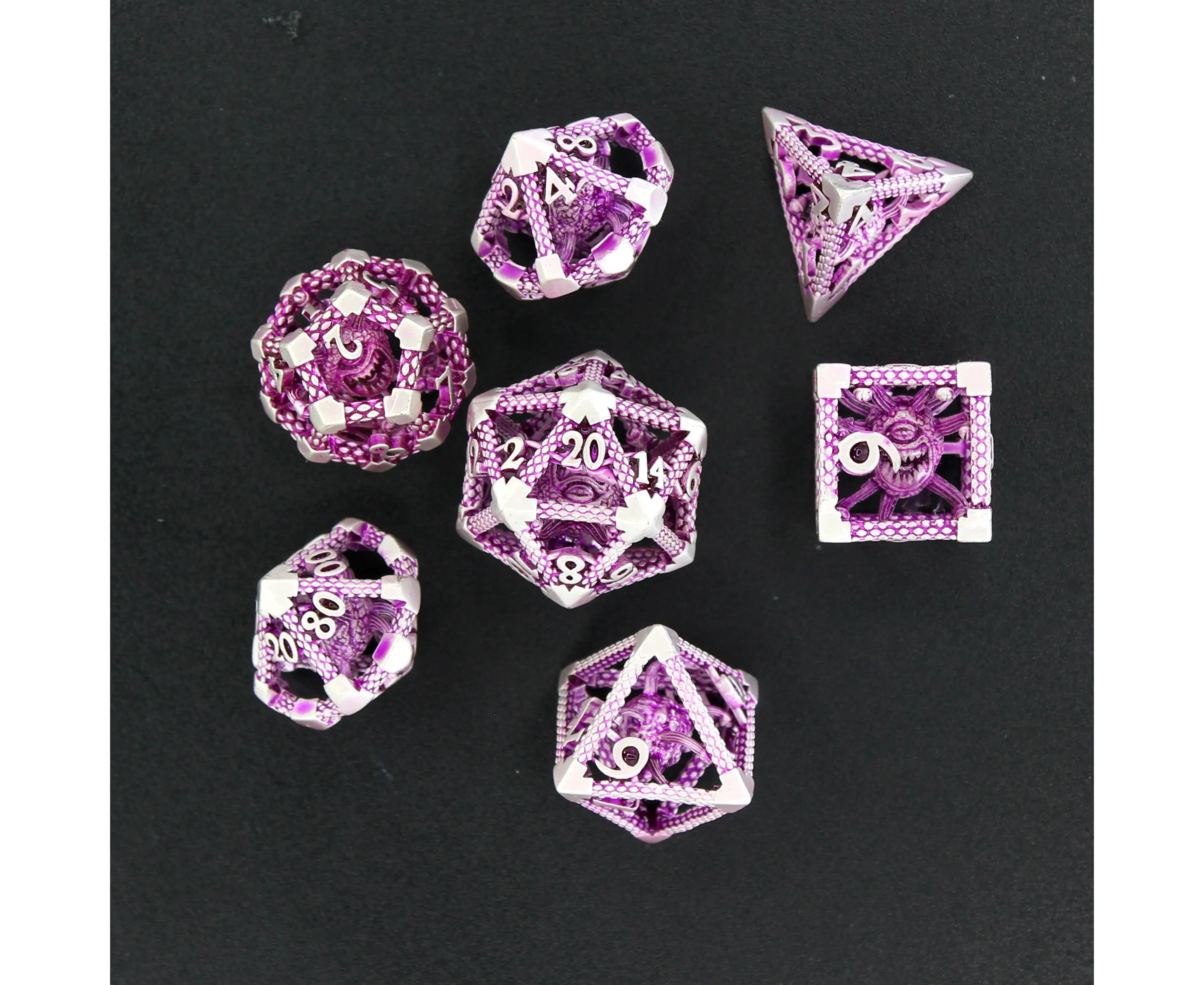This seven-piece hollow metal dice set features a sinister observing monster suspended within its hollow core, its many eyes peering out through the intricate metal framework. The dice are light pinking in color with a deeper pink in the recesses. The open design gives every roll a haunting depth and may give your character the sense they are being... watched.