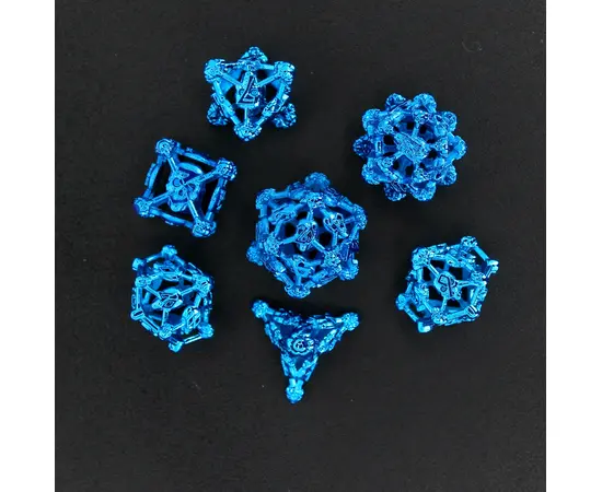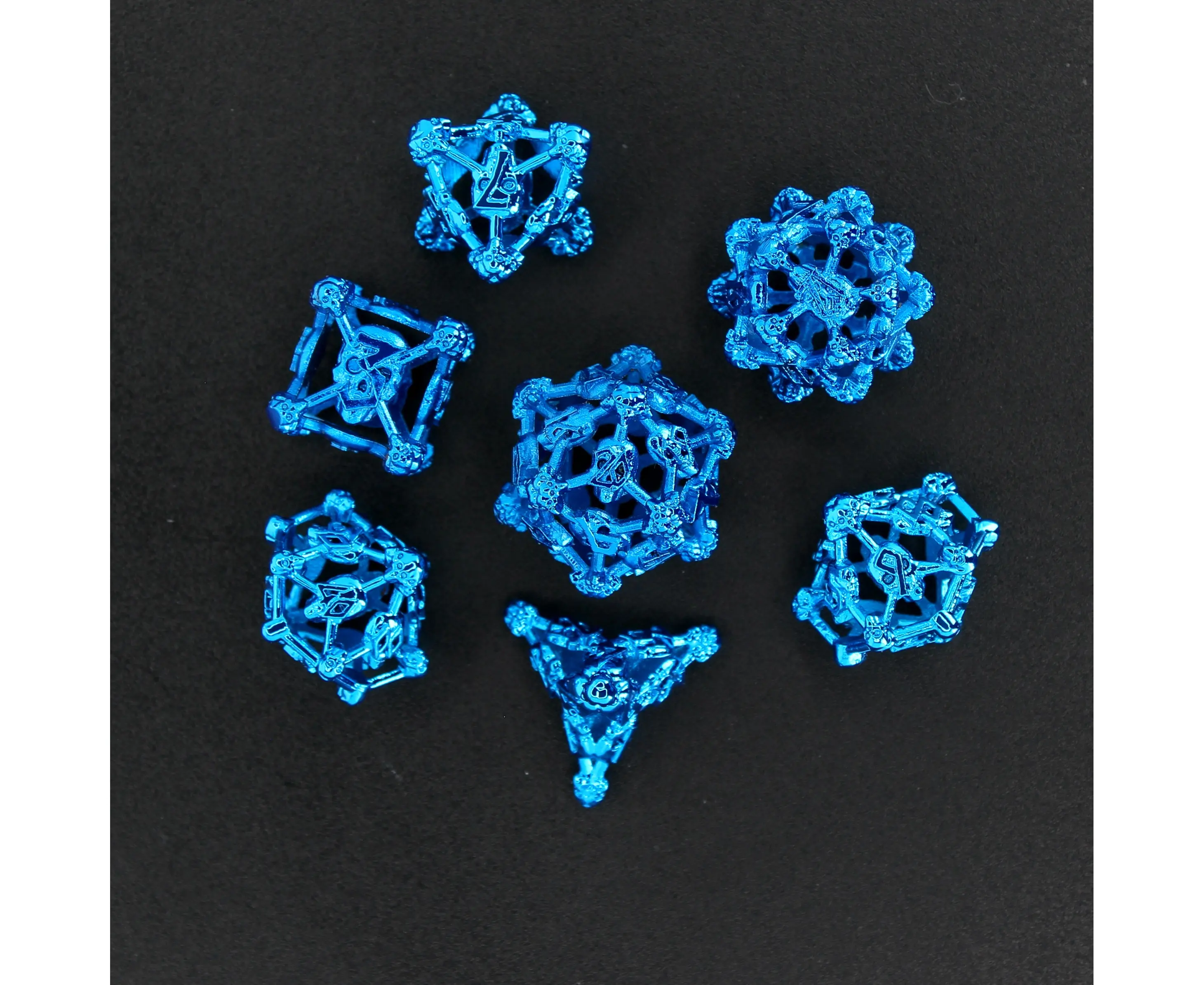 Bring a touch of grim majesty to your tabletop with this Hollow Metal Skull Dice Set. Cast in metallic blue, its frame formed from interlocking bars joined by grinning skulls at every point with a lattice of smaller skulls supporting each number. Perfect for necromancers or those who like the macabre style.