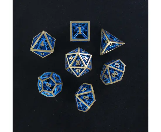 This seven-piece hollow metal dice set is detailed in bronze-colored tones with a bold blue painted lattice of crossed swords on every face. Each number is suspended within the blades, creating a striking layered design. Perfect for fighters, paladins, or anyone who lives by the blade.