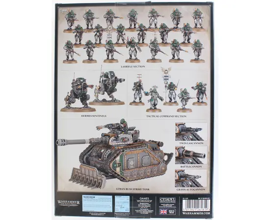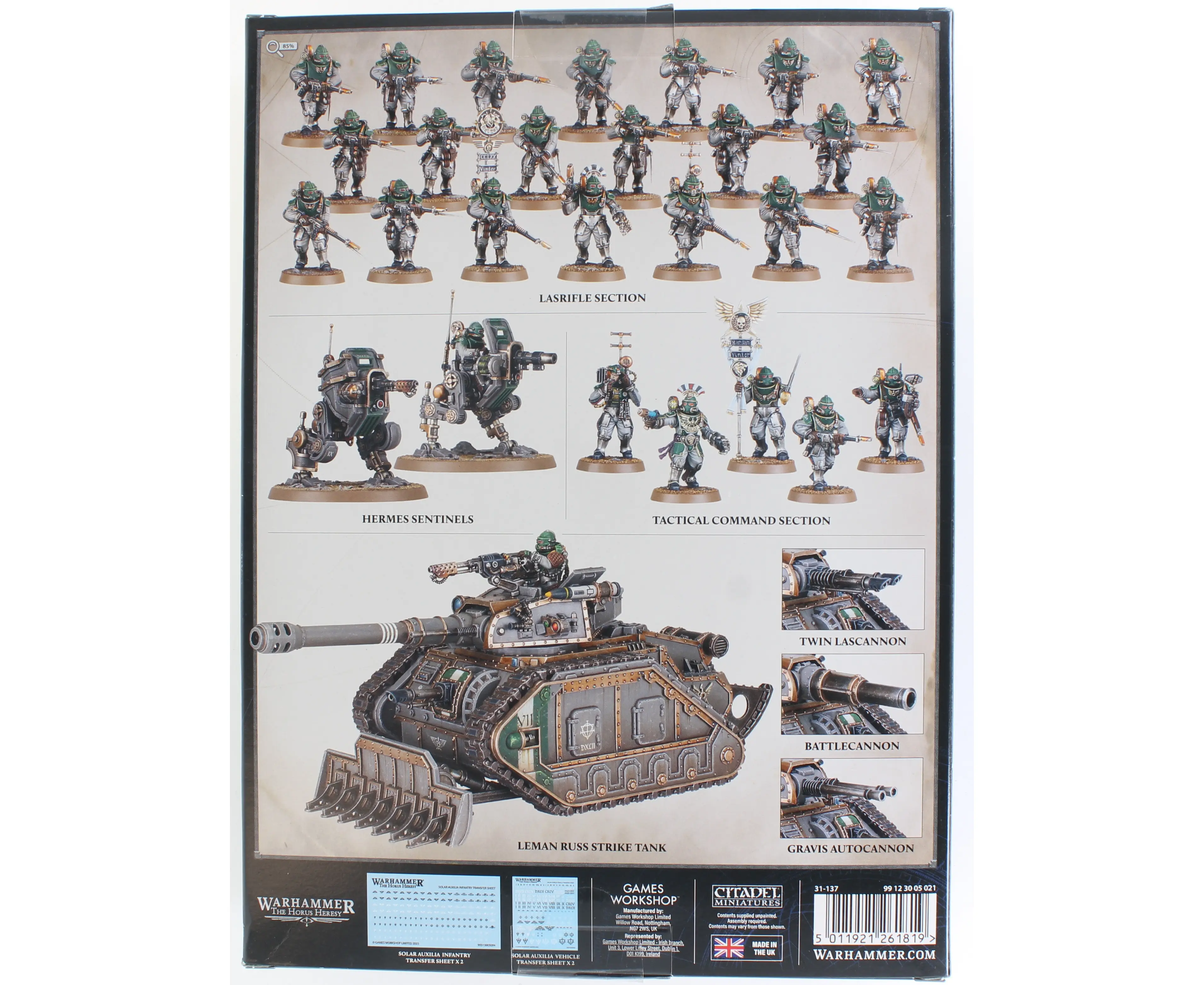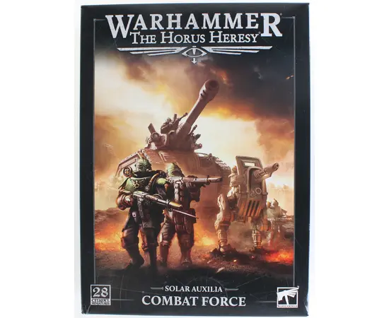 Show the Legiones Astartes the true strength of humanityÂ’s finest with the Solar Auxilia Combat Force, a versatile army set packed with elite infantry, armoured might, and customisation options. Leading the charge is a 20-strong Lasrifle Section, supported by a Tactical Command Section of five miniatures. A wealth of weapons and accessories are included, letting you customise your officer to stand out as the leader your Auxilia deserves. For battlefield flexibility, the set adds two Hermes Sentinels, which can be assembled as Light or Veletaris variants. Outfit them with multi-lasers or grenade launchers for the Light configuration, or heavy flamers or volkite calivers for the Veletaris. Heavy armour comes in the form of a Solar Auxilia Leman Russ, featuring multiple turret options (a battlecannon, twin heavy lascannons or autocannons, or a long-barrelled Vanquisher battlecannon with a co-axial autocannon) plus five different hull weapon choices. To round things out, youÂ’ll find two Solar Auxilia Infantry transfer sheets (152 transfers each) and two Vehicle transfer sheets (180 transfers each), so your force can march to war in full regimental heraldry.