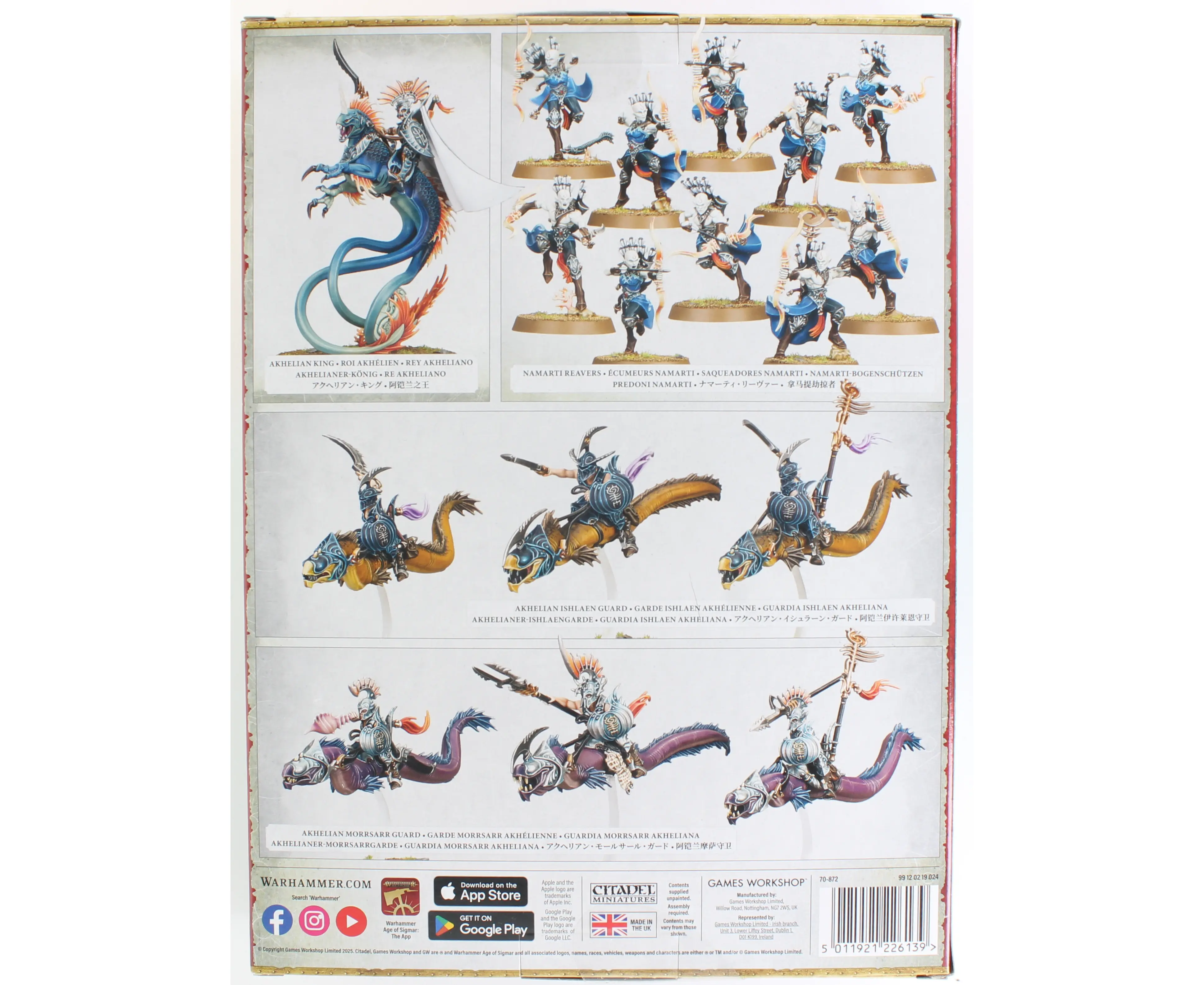 This lightning-fast Spearhead force is led by a fearsome Akhelian King, a brutal force in close combat who rallies his warriors with unmatched skill and ferocity. At his side fight the graceful yet lethal Akhelian Ishlaen Guard, the electrifying Akhelian Morrsarr Guard, and a deadly ranged unit of 10 Namarti Reavers. Working in perfect harmony, this elite force shields their monarch and cuts down anything that dares to stand in their path.In this box:1x Akhelian King3x Akhelian Ishlaen Guard3x Akhelian Morrsarr Guard10x Namarti ReaversThese models are supplied unpainted and require assembly.