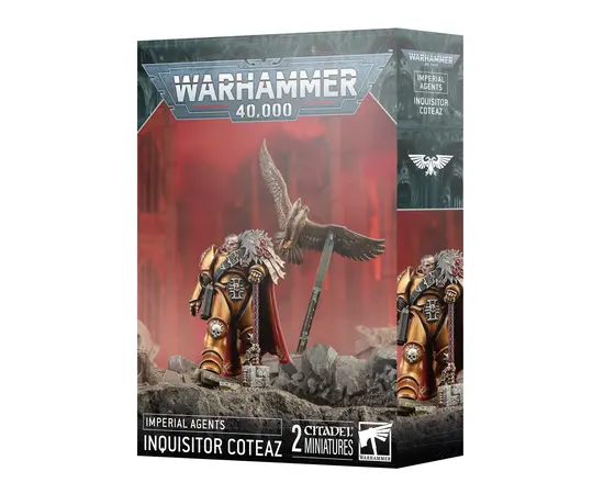 Inquisitor Coteaz expertly leads the Ordo Malleus to command his forces in battle, all while advancing to personally strike down heretics, traitors, and daemons with his notorious Nemesis daemon hammer. Meanwhile, his Glovodan Psyber-eagle soars above the fray. Previously we seen Coteaz in a Imperial Agents Battleforce but now he gets his own stand-alone release. This model is supplied unpainted and requires assembly.