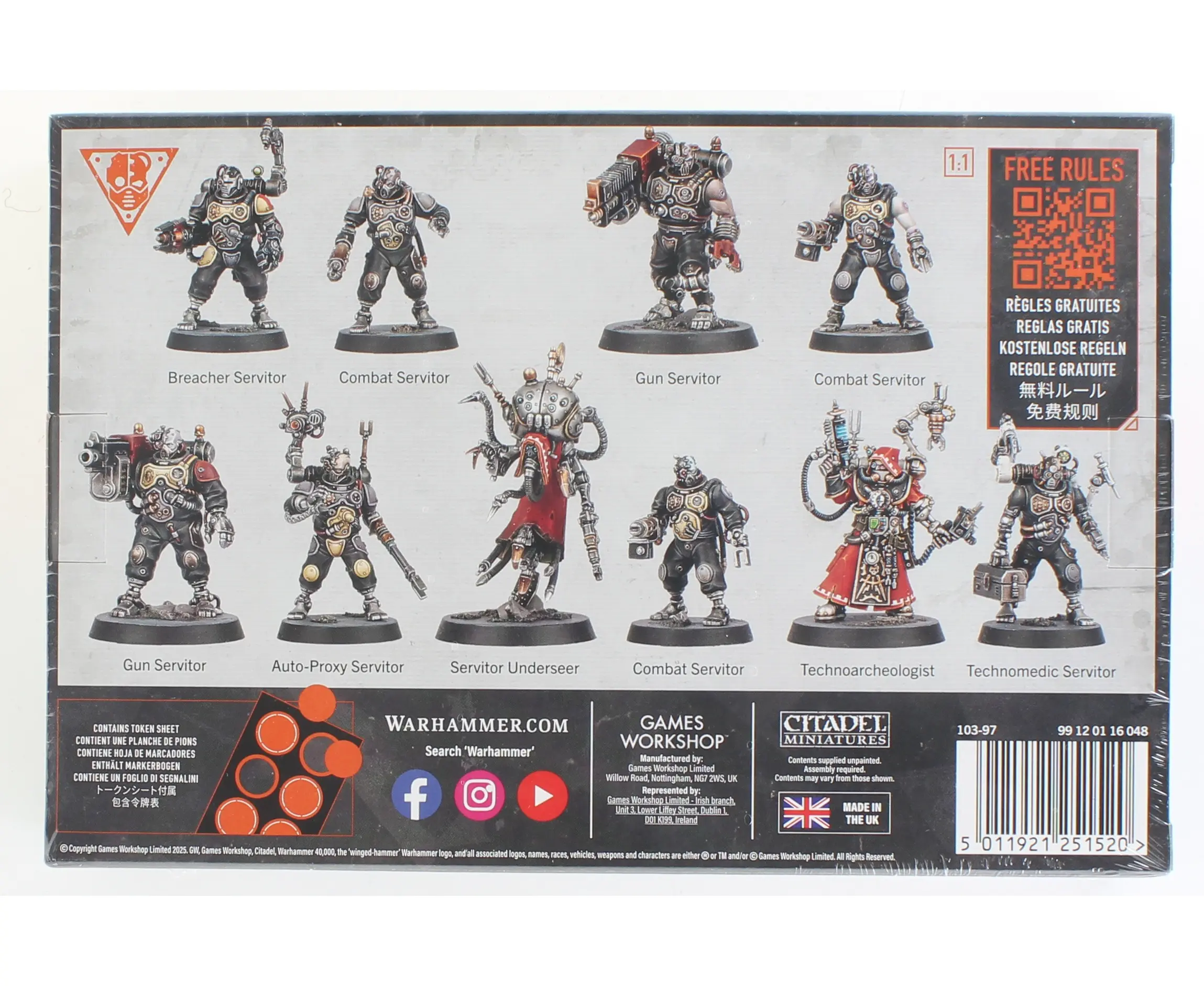 The Adeptus Mechanicus field Servitors to aid their Tech-Priests in securing archeotech or holding vital nodes, their seemingly inscrutable strategies unfolding under the direction of a Servitor Underseer. This set includes a Technoarcheologist, a Servitor Underseer, and eight versatile Servitors that can be assembled as Gun Servitors, Combat Servitors, or specialist operatives such as the Technomedic Servitor and Auto-Proxy Servitor. YouÂ’ll also find a set of bespoke tokens for Kill Team and a Battleclade transfer sheet featuring 64 decals.Models in this box are supplied unpainted and require assembly.