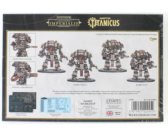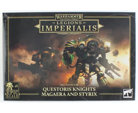 Households loyal to the Mechanicum are bestowed with the honor of piloting the most advanced steeds in their arsenal, like the formidable Knights Magaera and Styrix. Both are equipped with powerful ionic flare shields and self-repairing autosimulacra to keep them in fighting shape even in the heat of battle. This box includes four Knights that can be assembled as either Magaera or Styrix, a Mechanicum Knights transfer sheet with 419 transfers for full customization, plus one Magaera command terminal and one Styrix command terminal—perfect for your Adeptus Titanicus games. Command these advanced war machines and lead your forces to victory with unmatched might and resilience. These epic-scaled miniatures are supplied unpainted and require assembly.