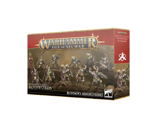 Feverish and unhinged, Rotswords surge into battle, their overpowering stench enough to break even the bravest warriors. They hack apart their enemies with manic zeal, spreading Nurgle’s gifts in the hope that their frenzied desecration will one day earn them a place among the Blightkings. This plastic kit builds 10 Rotswords, with dedicated options for a champion, musician, and standard bearer, plus a choice of two icons. It includes 12 interchangeable heads, 10 interchangeable weapons, and 10 interchangeable shields for extensive customization.