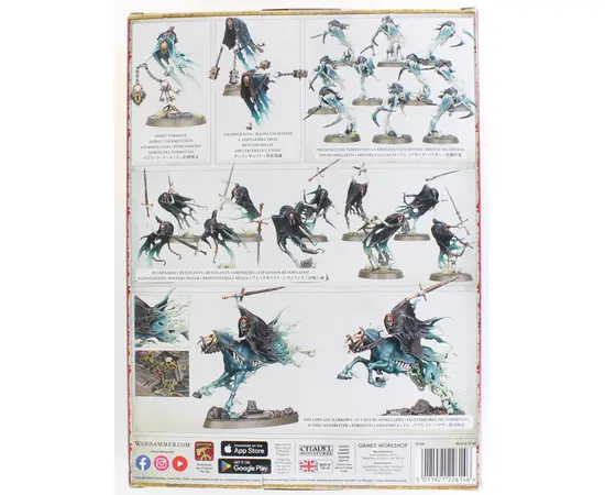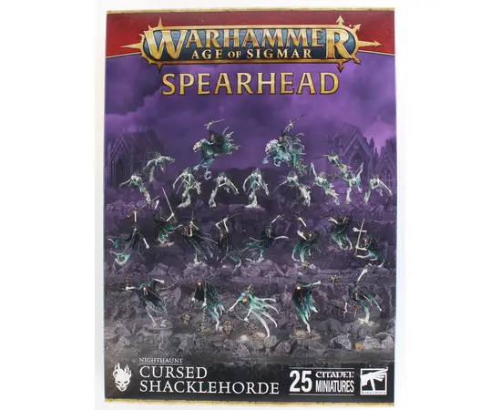 Led by a relentless Spirit Torment and their sinister Chainghasts, the Cursed Shacklehorde scour the battlefield to claim the souls of their prey for an underworld prison. This spectral strike force includes three haunting heroes, 10 savage Bladegheist Revenants, 10 deadly Dreadscythe Harridans, and two swift Dreadblade Harrows—riders who hunt down any who dare flee their doom.1 Spirit Torment2 Chainghasts10 Bladegheist Revenants10 Dreadscythe Harridans2 Dreadblade HarrowsModels in this box are supplied unpainted and require assembly.