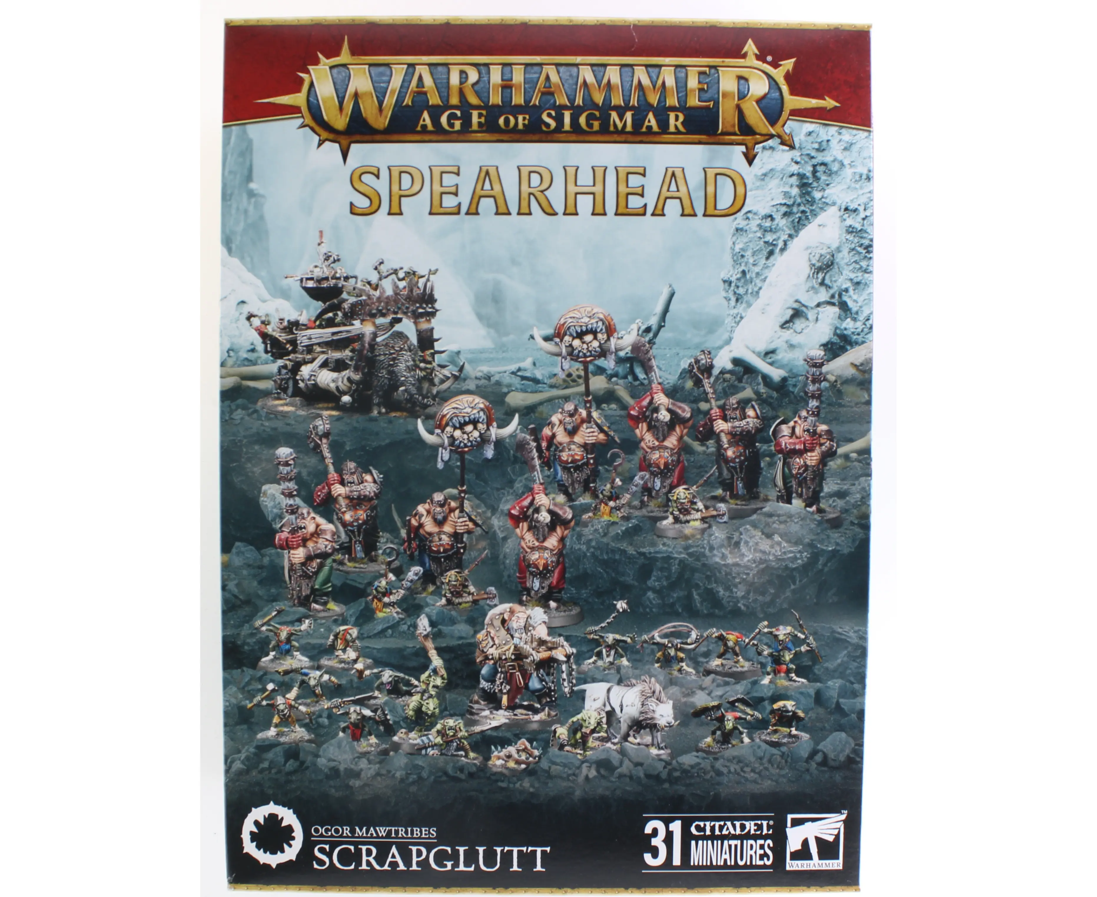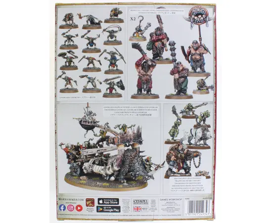Ogors are infamous for their endless appetite—but some take just as much satisfaction in repurposing battlefield debris into deadly instruments of destruction. The Scrapglutt is one such warband, led by a cunning Ogor Mantrapper and his loyal Frost Sabre, always on the hunt for valuable scrap and fresh prey.Backing him up are two units of two Ironguts, a larger unit of four Ironguts, a scrappy mob of 12 Gnoblars, and a hulking Gnoblar Scraplauncher—a ramshackle war engine that helps the diminutive Gnoblars punch well above their weight. Together, this brutal and resourceful warband turns trash into carnage.Scrapglutt Box Includes:1 Ogor Mantrapper1 Frost Sabre8 Ironguts12 Gnoblars1 Gnoblar ScraplauncherThese models are supplied unpainted and require assembly.