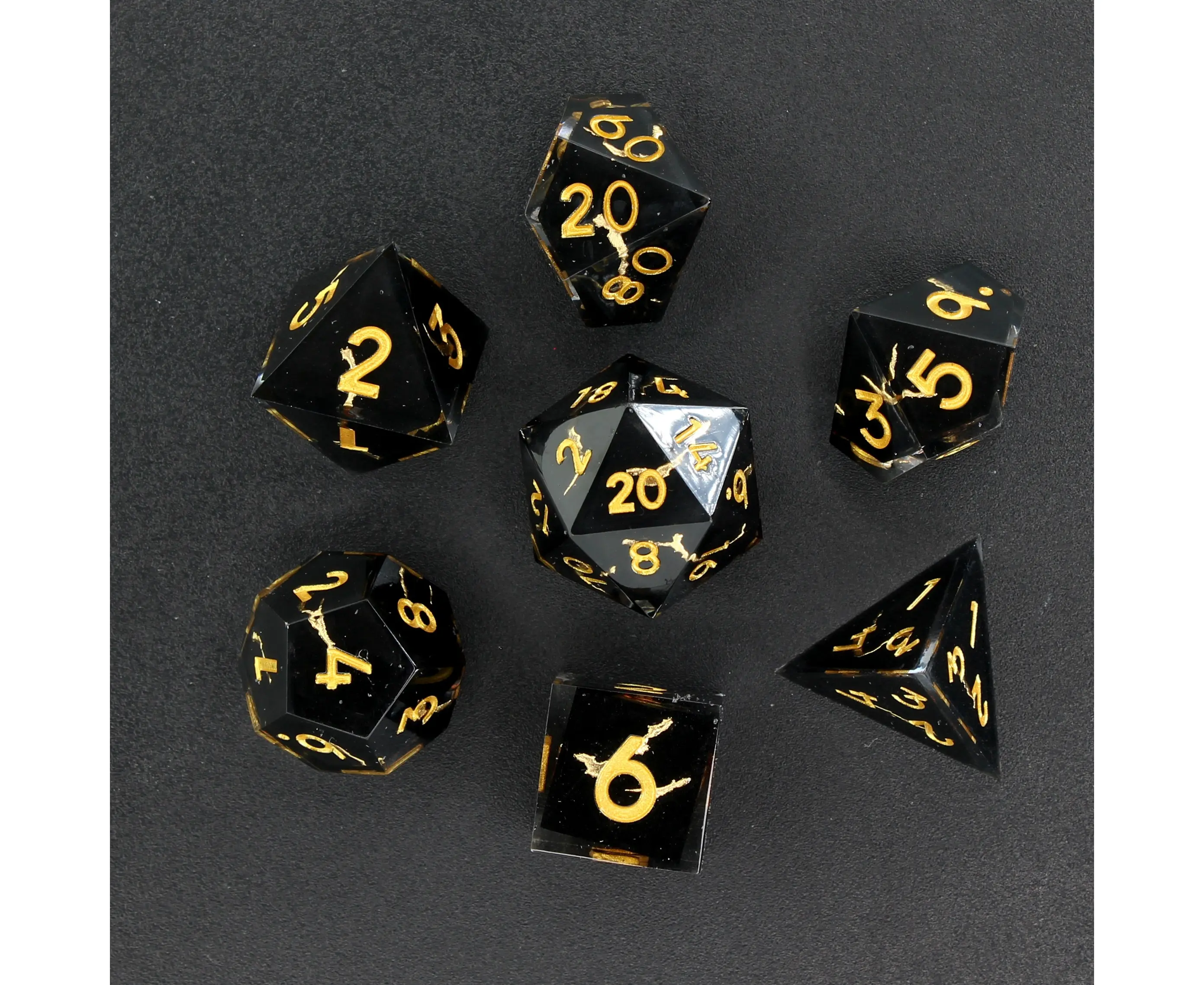 This set of polyhedral resin dice are cast in black and clear resin with striking gold flecks stylized to mimic gold cracks. Each number is inked with gold color for contrast.