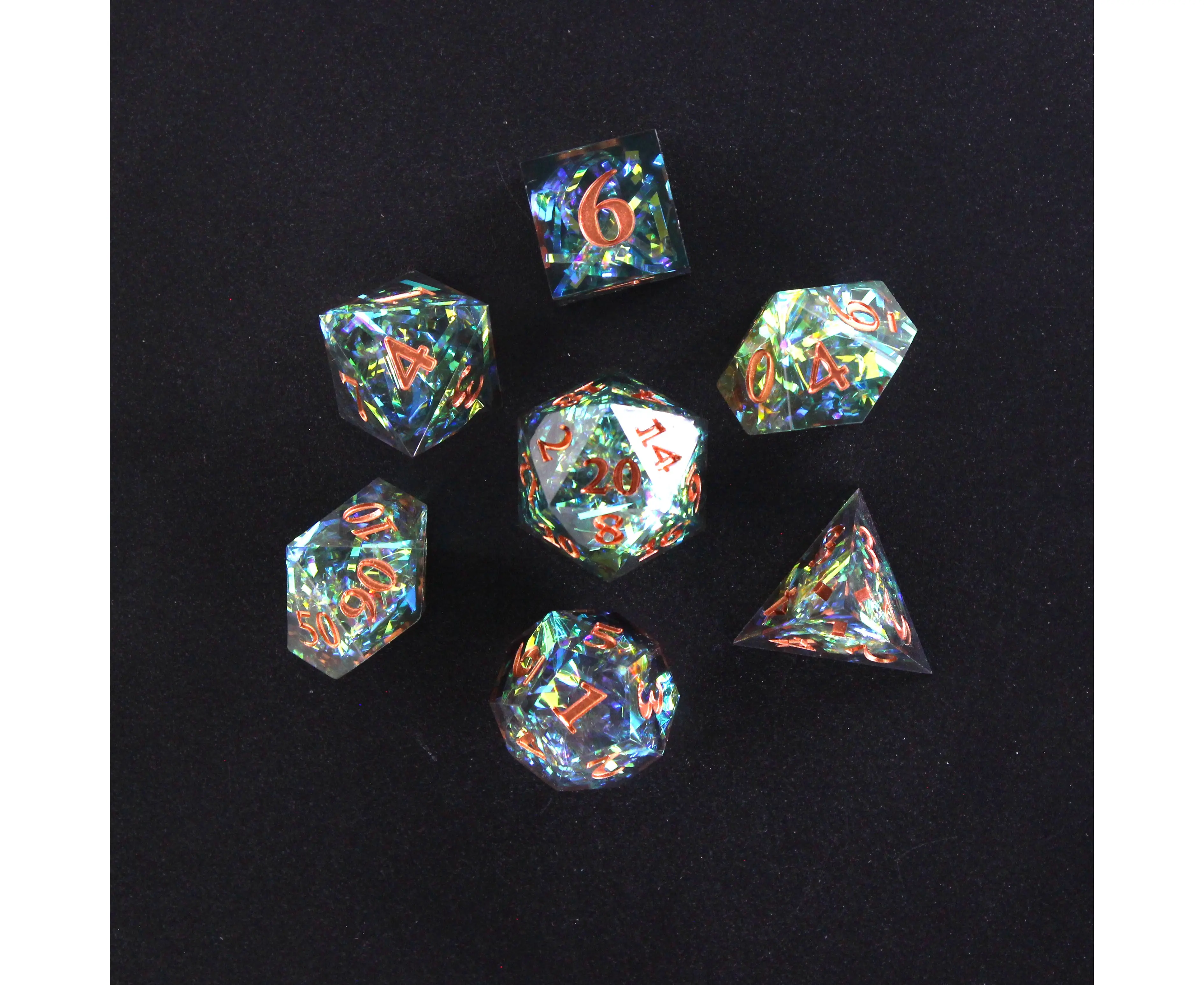 This set of polyhedral dice are cast in transparent clear resin, inked with copper color on every number. Suspended inside every die are tiny strips of green pearlescent-like ribbon causing every roll to shimmer.