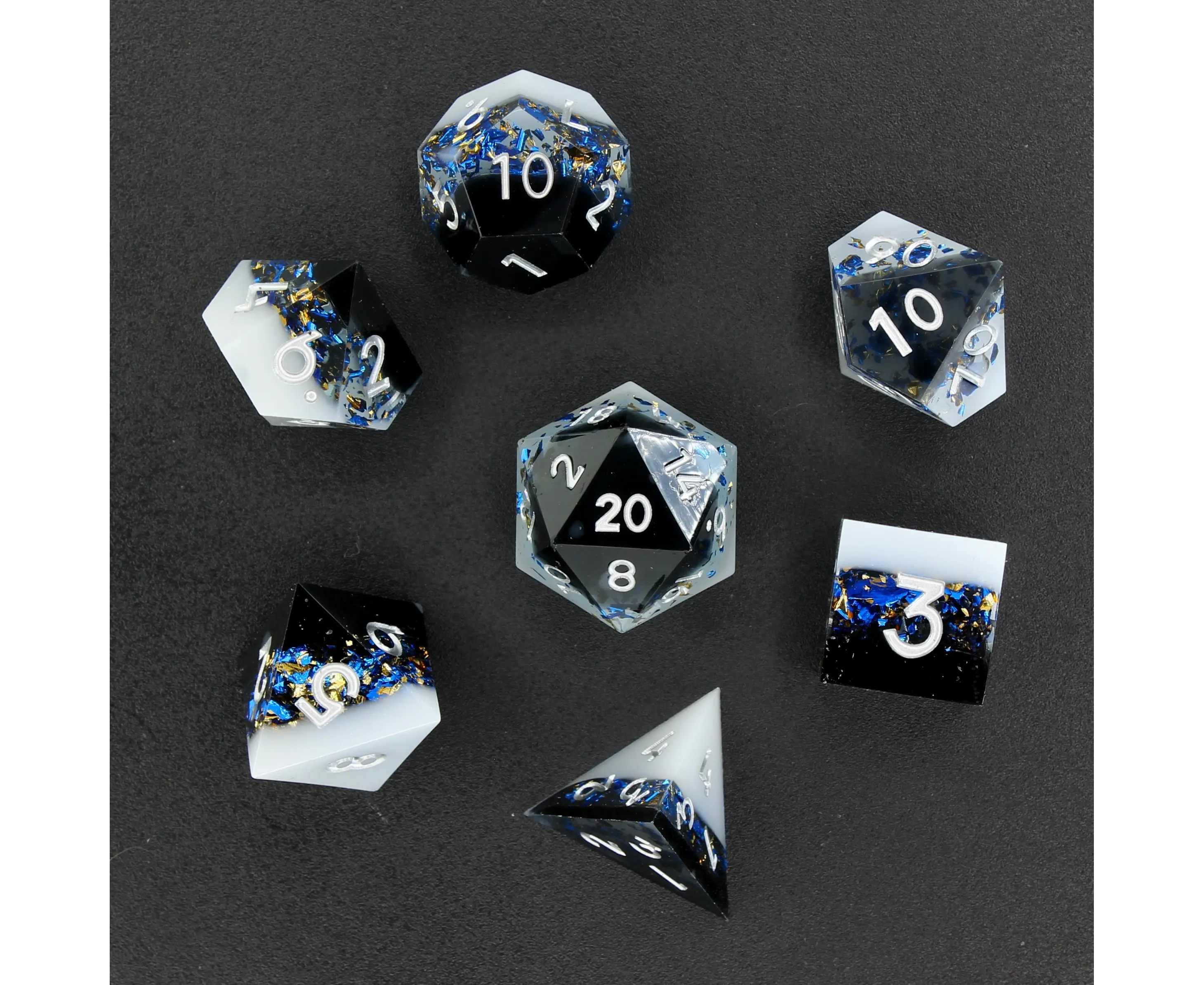 Each die features a striking contrast of opaque white and deep black, separated by a crystal-clear acrylic layer that reveals shimmering blue and gold glitter foil suspended within. The result is a shimmer that shines with every roll.