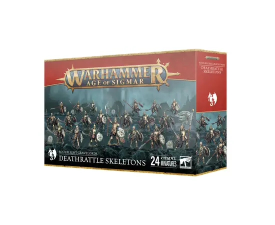 The Deathrattle Skeletons are relentless undead soldiers who march in unyielding formation, wearing down their enemies through sheer numbers and grim persistence. As necromancers summon fresh corpses to the fray, the tide of death only grows, turning battlefields into graveyards under their command. This updated kit includes 20 redesigned Deathrattle Skeletons, now easier to assemble and featuring interchangeable arms for blades, spears, and shields. YouÂ’ll also find options to build two champions and two standard bearers, along with four decorative tombstones to enhance your grim host.These models are supplied unpainted and require assembly.