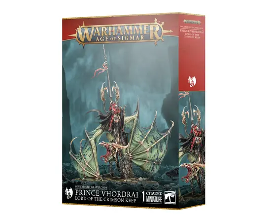 Prince Vhordrai is a merciless chevalier who leads his Blood Knights in an unending war against the living. From his phantasmal stronghold that drifts across the Mortal Realms, he strikes with a blend of lethal sorcery and peerless martial skill, mounted atop the monstrous undead Draconith, Shordemaire.