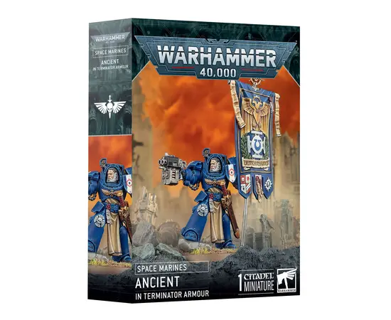 Space Marines march to war beneath sacred banners that embody their unwavering resolve and such revered standards deserve a guardian worthy of their honor. Enter the Ancient in Terminator Armour, a formidable protector clad in massive ceramite plate, ensuring your ChapterÂ’s colours remain aloft in even the fiercest battles. This versatile plastic kit offers plenty of customization, including two distinct banner topper options, two right-arm poses, and a selection of four heads: one fully helmeted, one half-helmeted, and two bare. Build your Ancient to perfectly match the style and spirit of your Space Marine force.