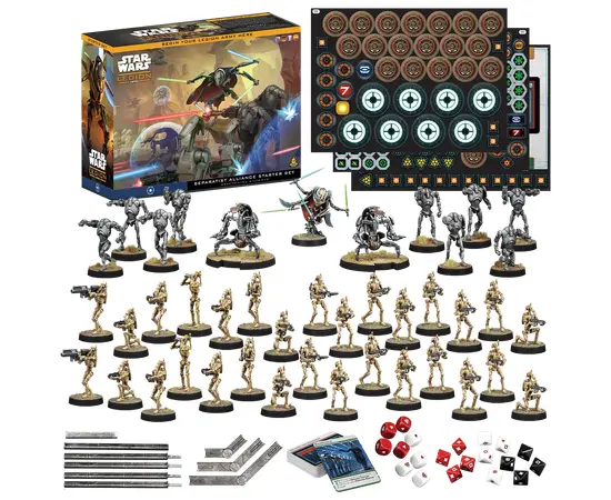 The Separatist Alliance was formed by outlying star systems that aligned themselves against what they believed to be a corrupt Galactic Republic. Exploiting their sizable workforce, the Separatist Alliance has created a massive droid army that it frequently deploys to push back against the Galactic RepublicÂ’s control. While these battle droids are not the most proficient fighters, the vast amount of them the Separatist Alliance is able to put onto the battlefield has made them a considerable threat to the Republic. The Separatist Alliance Starter Set contains a 600-point Recon-level army and all the dice, templates, tools, and tokens a player needs to begin playing their first games of Star WarsTM: Legion. When a player is ready for even bigger games, this starter serves as an ideal starting point for players to expand and customize their armies with additional units from other Star Wars: Legion unit boxes.