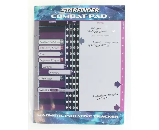 Maintain the flow of combat with the Starfinder Combat Pad initiative tracker, now optimized for use with the new Starfinder Second Edition! Usable with any roleplaying game, this board includes magnets that stick right to it! List the names of heroes and foes on the magnets using a wet or dry erase marker, then place them in initiative order. Easily track when a character delays their turn or starts dying by sliding the magnets. Take the uncertainty out of battle with the Starfinder Combat Pad!