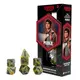 FEATURES:This heavy duty set of 7 polyhedral die are made of solid METALEach set of 7 die contains one of each D4, D6, D8, D10 numbered 0-9, D10 marked in tens 00-90 for percentages, D12, and a D20Dice DimensionsD20: 22mm, D6: 16mm, D12: 18mm, D10: 16mm, D%: 16mm, D4: 18mm, D8: 14mmThe dice included with this set are just what you need for RPGs such as Dungeons and Dragons, Cyberpunk, Call of Cthulhu, Shadowrun, Pathfinder, Savage World, Warhammer, Rune Quest, Heroscape, and many other RPG and card gamesFeatures a metal case that easily fits in your pocket with a padded lid that doubles as a dice trayThese heavy dice roll consistently and have deep stamped numbers with hand painted coloring for easy readabilityLid can be used as a surface to roll dice.Made of strong Aluminum-Zinc Alloy.Comes in a collectible storage tin with foam compartments for each dice.