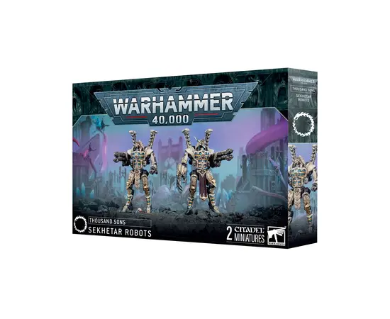 Summoned to guard the sacred places of the Thousand Sons, the Sekhetar Robots are towering automatons etched with runes of obfuscation and bound by potent sorcery. This kit builds two Sekhetar Robots, each armed with heavy warpflamers, hellfyre missile racks, and pyreflux meltaguns – with the option to swap the meltaguns for brutal power claws. Perfect as both guardians and frontline destroyers, they bring the wrath of the warp to any battlefield.