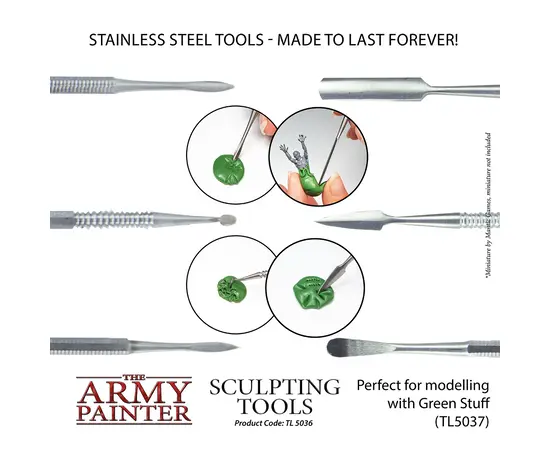 These sculpting tools, when used in conjunction with Green Stuff, offer the modeling hobbyist a range of different shapes for any sculpting project.