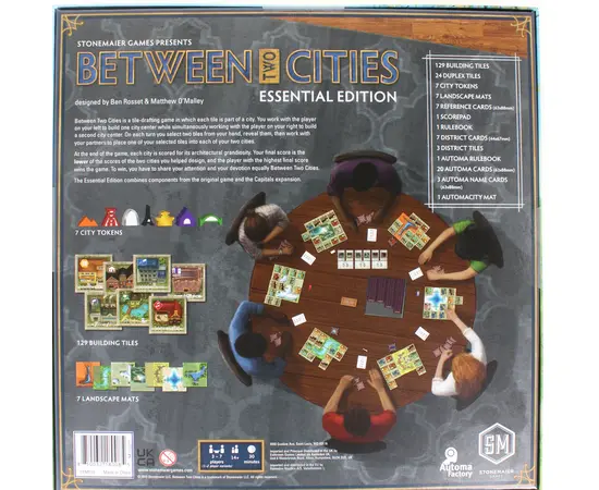 Between Two Cities is a tile-drafting game in which each tile is part of a city. You work with the player on you left to build one city center while simultaneously working with the player on your right to build a second city center. On each turn you select two tiles from your hand, reveal them, then work with your partners to place one of your selected tile into each of your two cities.