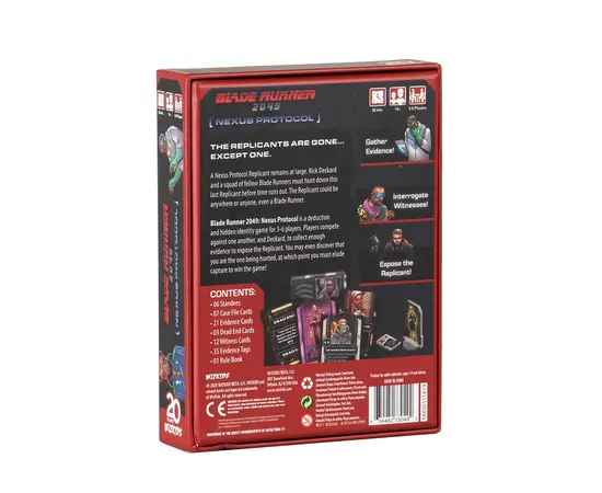 Blade Runner 2049: Nexus Protocol is a deduction and hidden identity game for 3-6 players. Players compete against Deckard and each other to hunt down the last replicant. Collect evidence by interrogating witnesses to finally expose their hidden identity. You may even discover that you are the one being hunted - can you evade capture to win?
