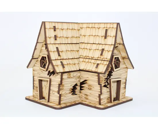 Caje is a small L-shaped cottage where each leg of the "L" is 4-1/2 inches. Each of the roof tops also reach 4-1/2 inches high. Details include wood plank walls, plank doors and roof with etched tile. The doors and roof are removable to allow interior play. All pieces are cut from sturdy 3mm MDF board. This kit ships unassembled and unpainted.