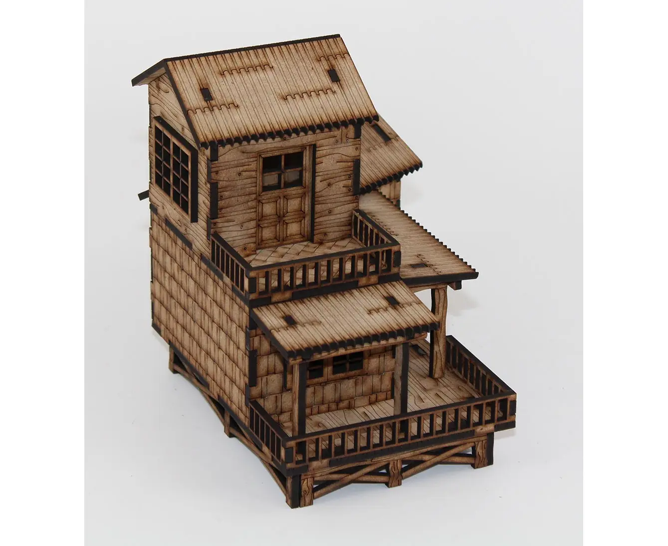 Well-built home constructed on risers covering approximately 7.5 by 5 inches of table space. The small second story room (and its roof) and porch are removable allowing the entire piece to be used. The risers are 3/4 inch above your play surface.