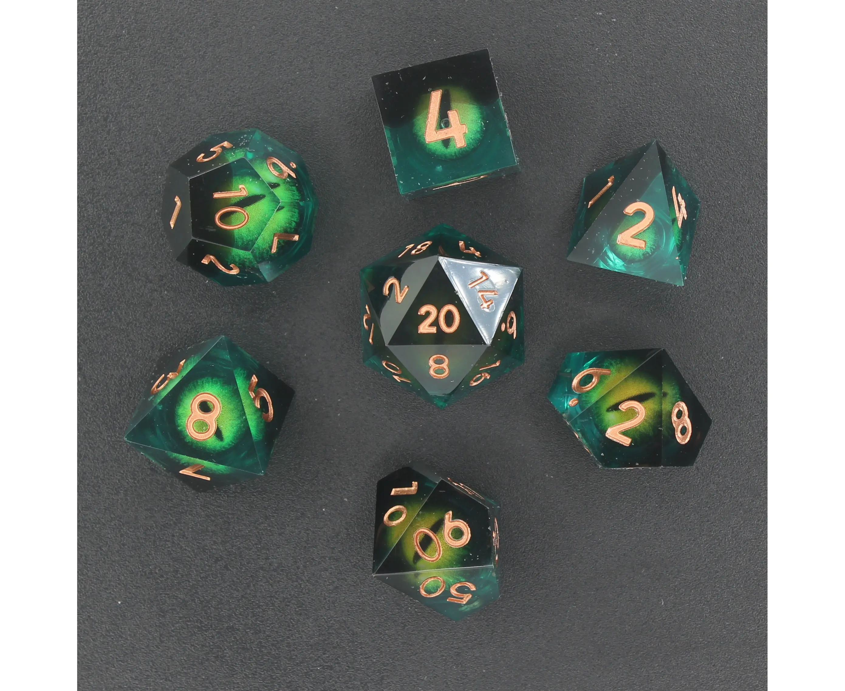 This set of polyhedral dice is cast in transparent green and black resin, with every number inked in copper. Inside each die is a liquid core that suspends a dragon’s eye, which reacts to gravity and always looks upward. The dragon watches over every roll!
