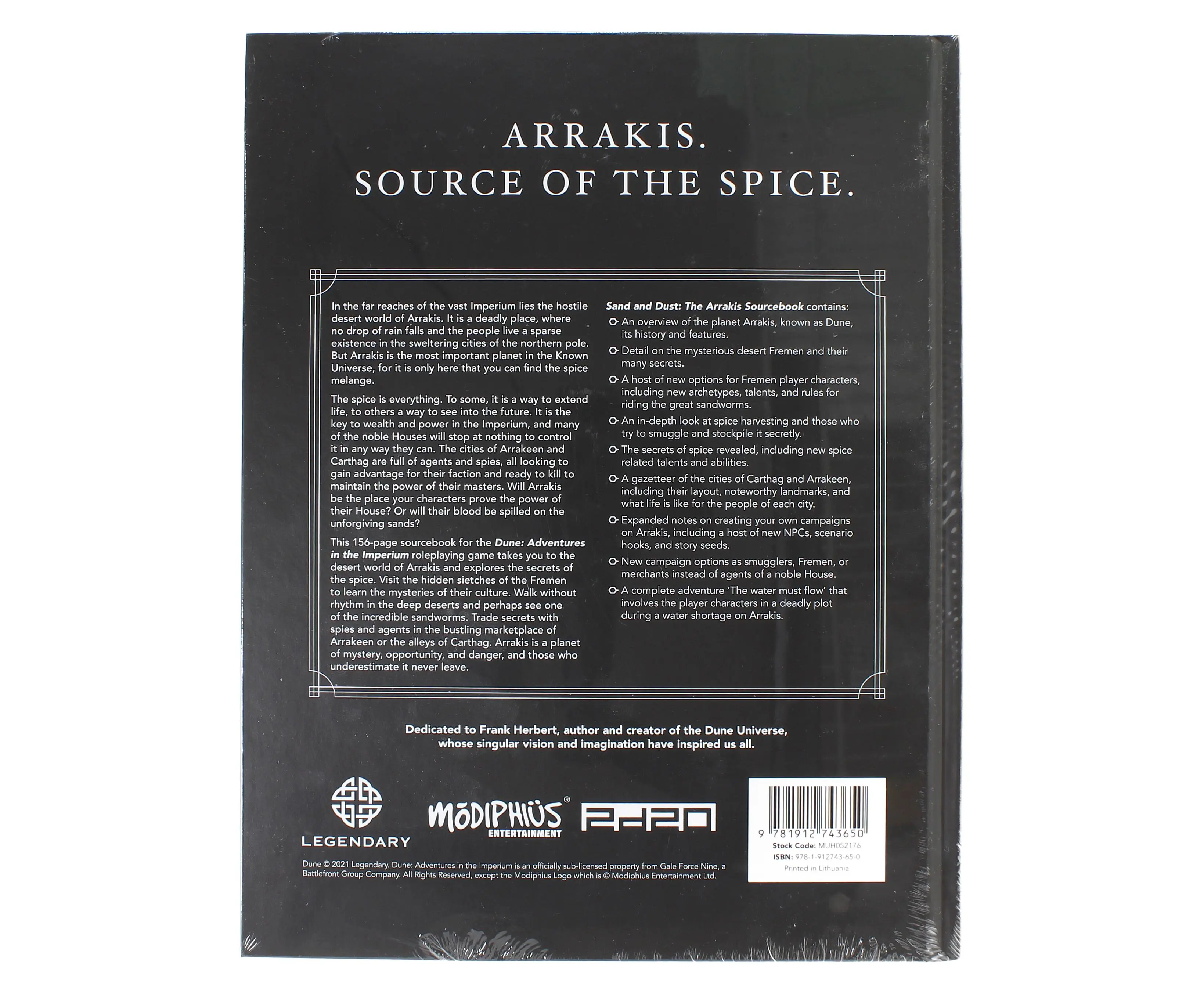 This sourcebook for the Dune: Adventures in the Imperium roleplaying game, takes you to the desert world of Arrakis and explores the secrets of the spice. Visit the hidden sietches of the Fremen to learn the mysteries of their culture. Walk without rhythm in the great deserts and perhaps see one of the incredible sandworms. Trade secrets with spies and agents in the bustling marketplace of Arrakeen or the alleys of Carthag. Arrakis is a planet of mysteries and danger, and those who underestimate it never leave.