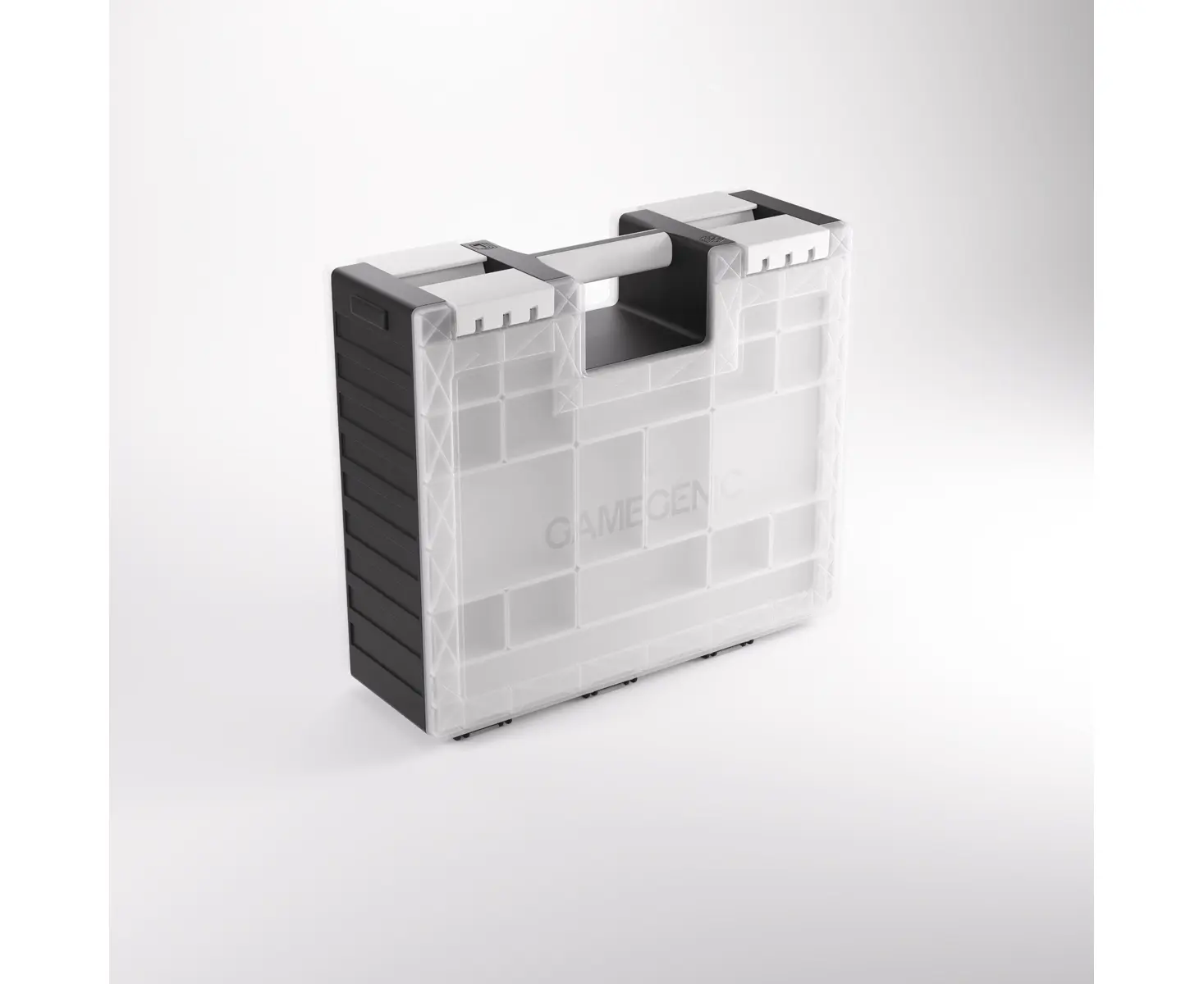 The Game Castle is a perfect storage solution for 6 Commander Decks** (6x 100 double-sleeved cards), tokens, dice, movement/range tools, and many other gaming accessories! One side of the box houses six removable card holders for 600 double-sleeved cards in Thick Inner Sleeves or 800 board-game-sleeved cards. The other side holds 19 removable trays in 5 different sizes, including an extra-long tray to store movement/range tools, two trays in Mini-American card size, and two in Standard Card Game size. The trays can be swapped with those from the Gamegenic Token Silo and the Token Silo Cards Add-on, offering many different size and color combinations. The innovative clip mechanism ensures precise and secure closure.