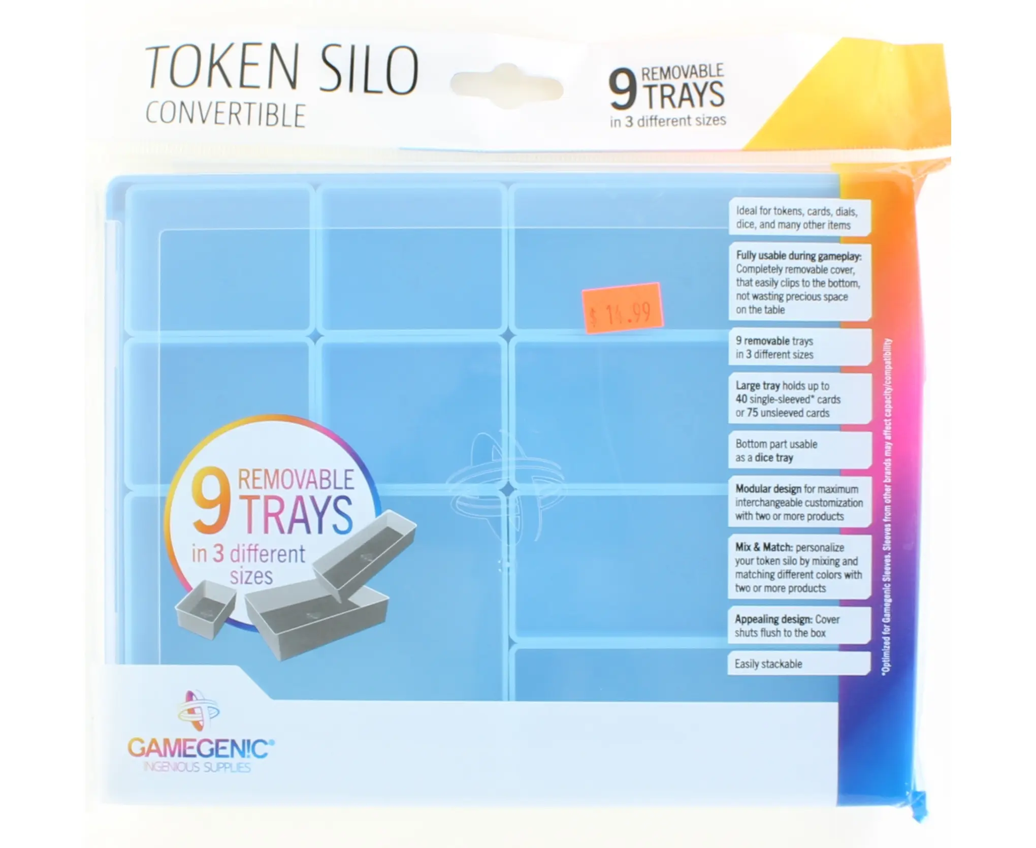 Save precious space on your board game table with our revolutionary, convertible, Token Silo. Just clip the cover to the bottom of the box for easy access to all your tokens. This unique, convertible box stores and organizes a variety of tokens, cards, dials, dice, and many other items. The Token Silo comes with 9 trays in 3 different sizes, that are fully removable to keep your accessories handy during the game. The boxes can be stacked several times and are made of durable, robust material. It is available in several vibrant colors which can be mixed and matched.