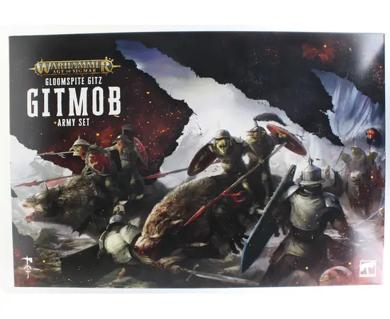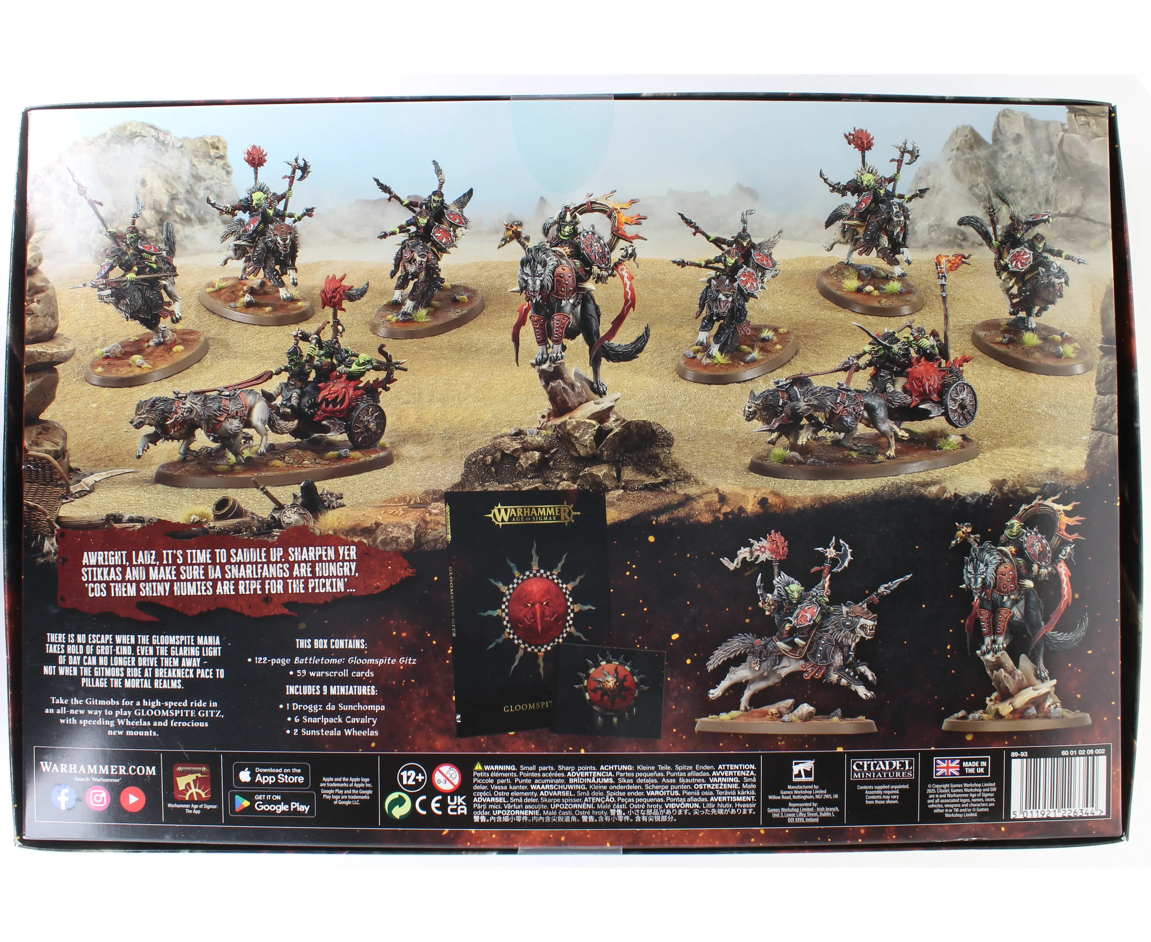 The Gitmob Army Set features the wolf-riding leader, Droggz da Sunchompa, alongside two units of Snarlpack Cavalry and two Sunsteala Wheelas. This set also debuts Battletome: Gloomspite Gitz, brimming with lore, rules, and a striking cover exclusive to this army box. Additionally, it includes warscroll cards for your faction, two Regiments of Renown, Armies of Renown, Spearhead rules, and all 43 warscrolls for your army.