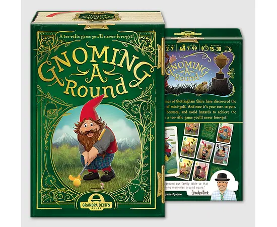 he curious gnomes of Stottingham Shire have discovered the enchanting game of mini-golf. And now it’s your turn to putt. Form sets, seek bonuses, and avoid hazards to achieve the lowest score. It’s a tee-rific game you’ll never fore-get!