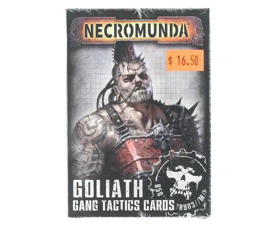 A handy set of 26 cards for use by House Goliath gangs in Necromunda. Contains 18 tactics cards and 8 blank fighter cards. This is a reprint of the previously available first edition of the Goliath Gang Tactics Cards deck.