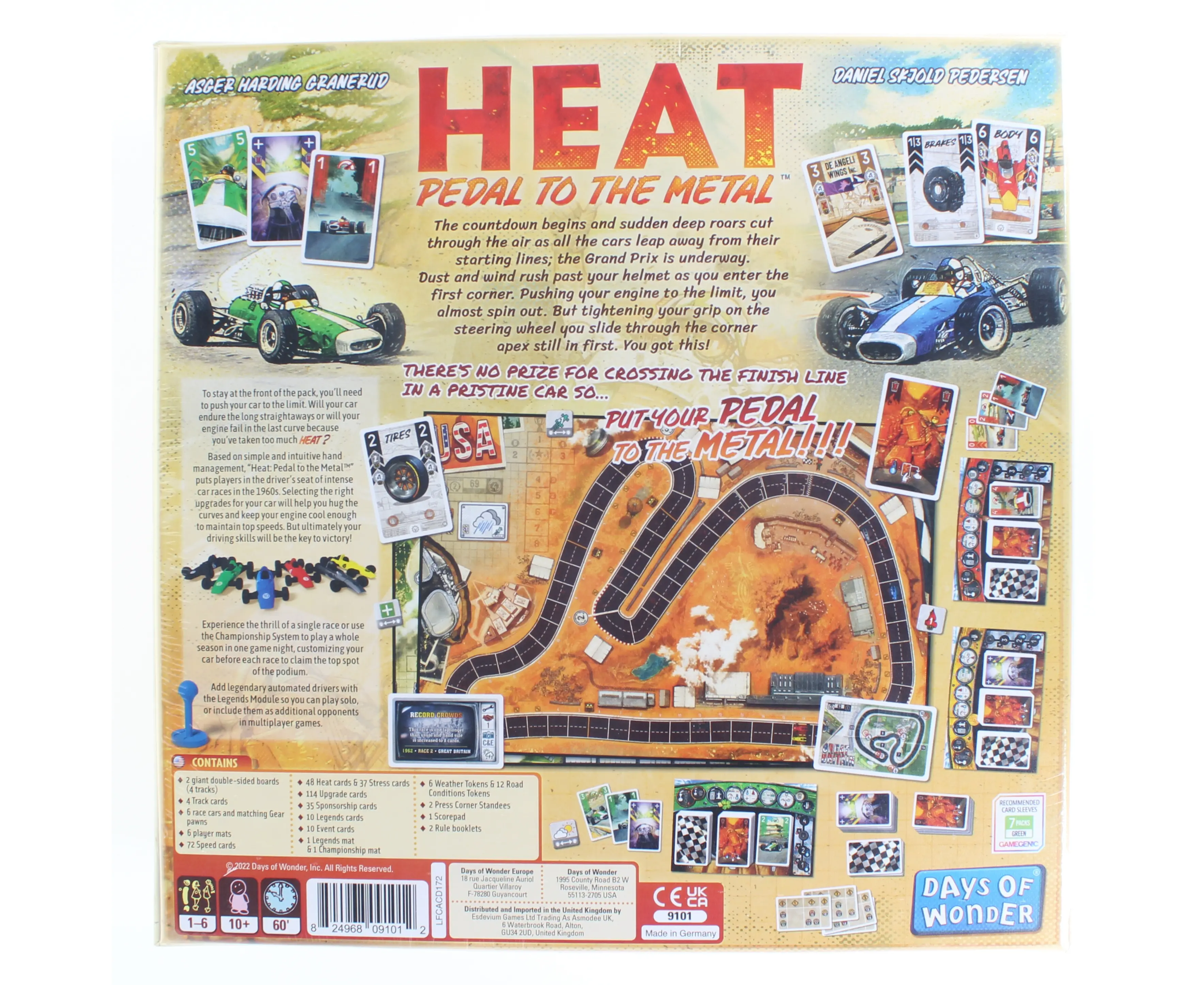 Based on simple and intuitive hand management, Heat: Pedal to the Metal puts players in the driver's seat of intense car races, jockeying for position to cross the finish line first, while managing their car's speed if they don't want to overheat. Selecting the right upgrades for their car will help them hug the curves and keep their engine cool enough to maintain top speeds. Ultimately, their driving skills will be the key to victory!