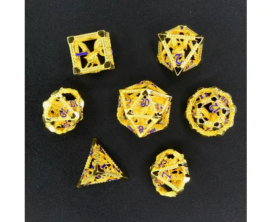 This seven-piece hollow metal dice set features a miniature dragon suspended within its hollow core. The intricate metal framework surrounds the creature like a gilded cage, allowing light to glint off its form with every movement. The glossy gold colored and each number is painted with purple paint to ensure readability in every roll.